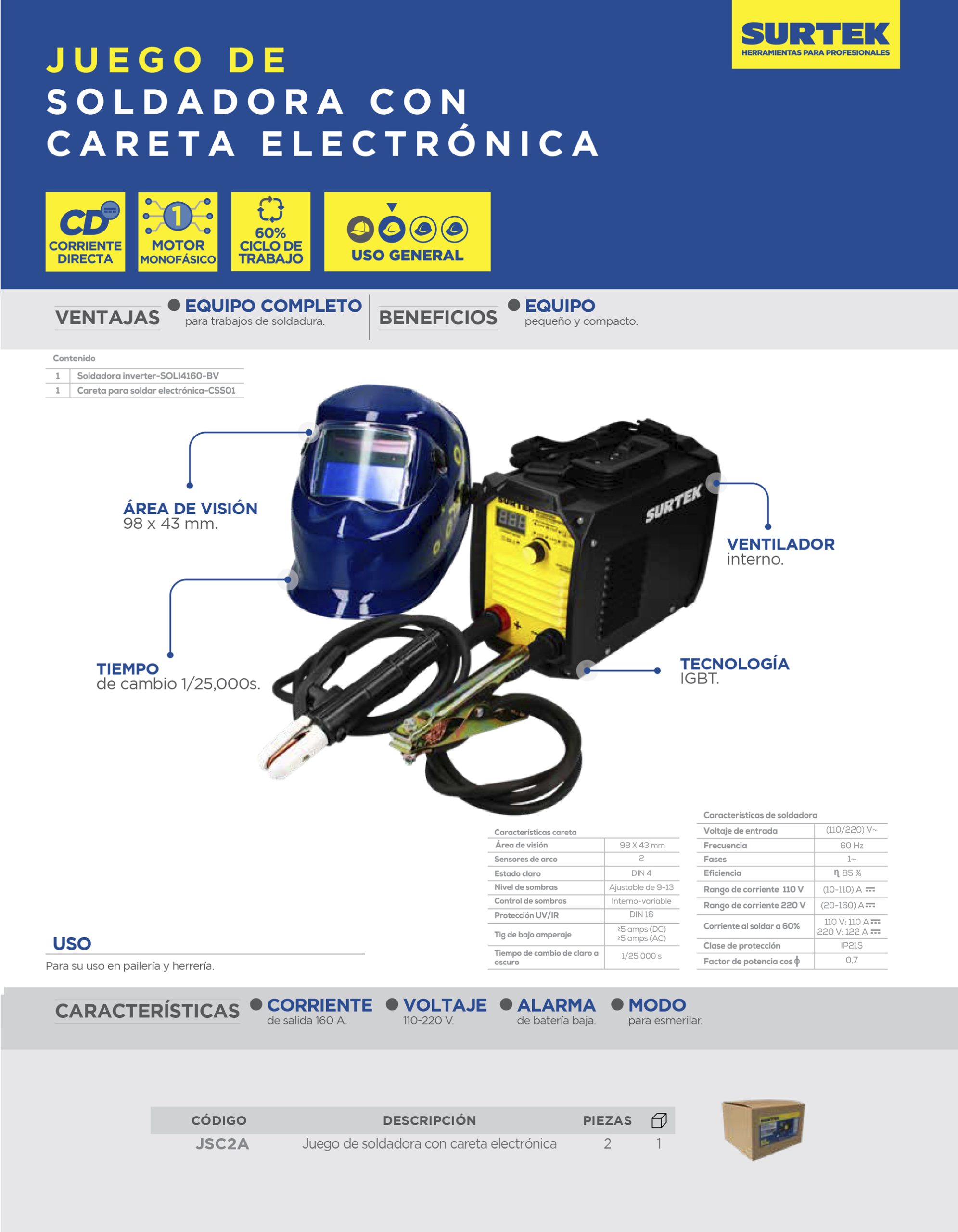 SOLI4160-BV Soldadora inverter 160A 110220V 1pz. CSS01 Careta parar soldar electrónica, solar 1pz.
