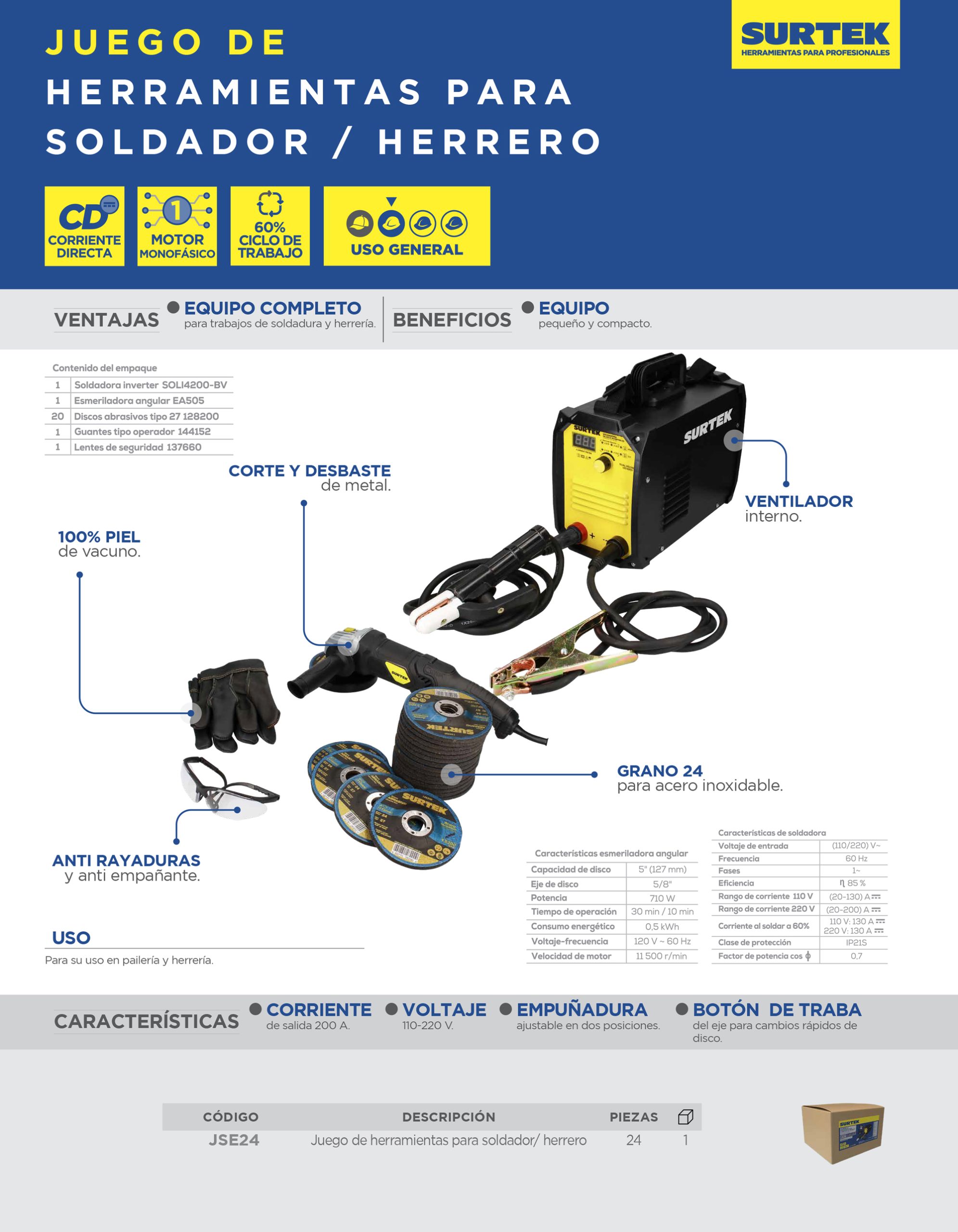 SOLI4200-BV – Soldadora inverter 200A 110-220V – 1pz, EA505 – Esmeriladora angular 4-1/2,5″ 710W – 1pz, 128200 – Disco t/27 inoxidable 4-1/2×1/4″ – 20pz, 144152 – Guantes tipo operador – 1pz, 137660 – Lentes seguridad Confort – 1pz.
