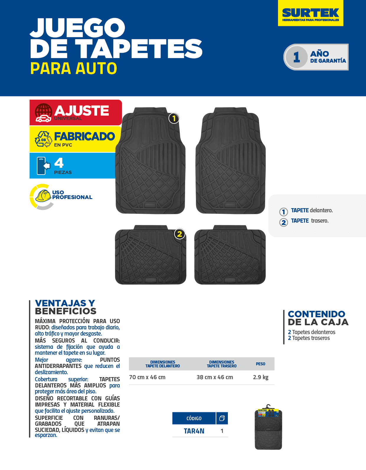 Juego de tapetes para auto uso rudo, 4 piezas, color negro Surtek