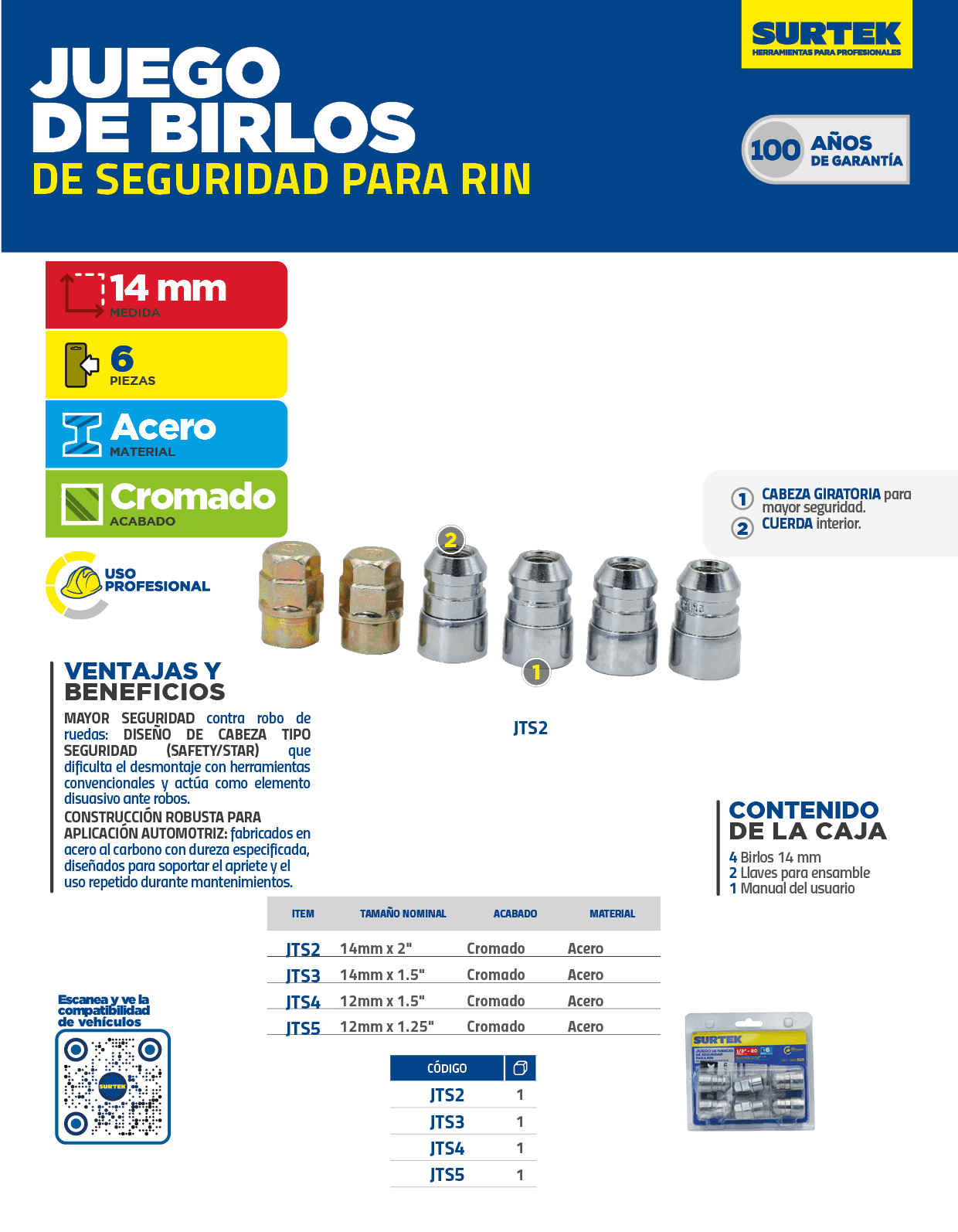Juego de tuercas de seguridad para rin, 6 piezas, 14mm x 2″ Surtek