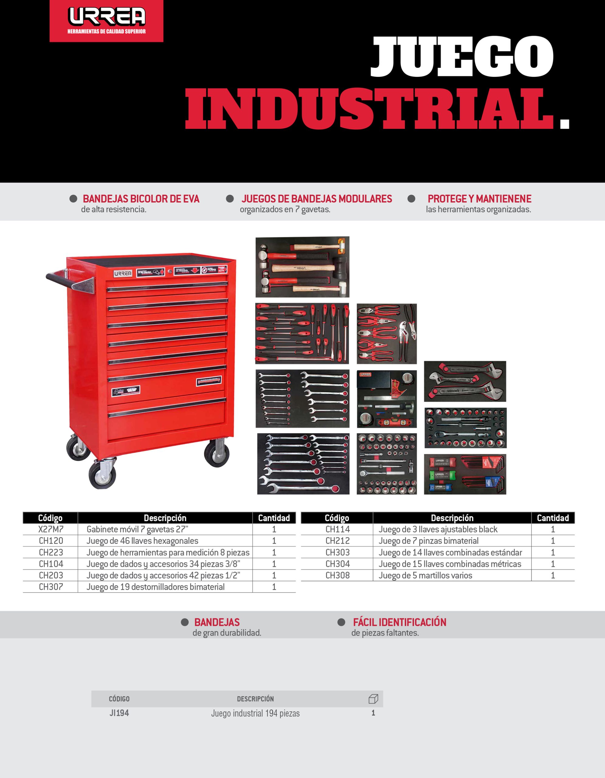 Juego industrial con organización modular de 7 gavetas 194 piezas, con gabinete X27M7 Urrea