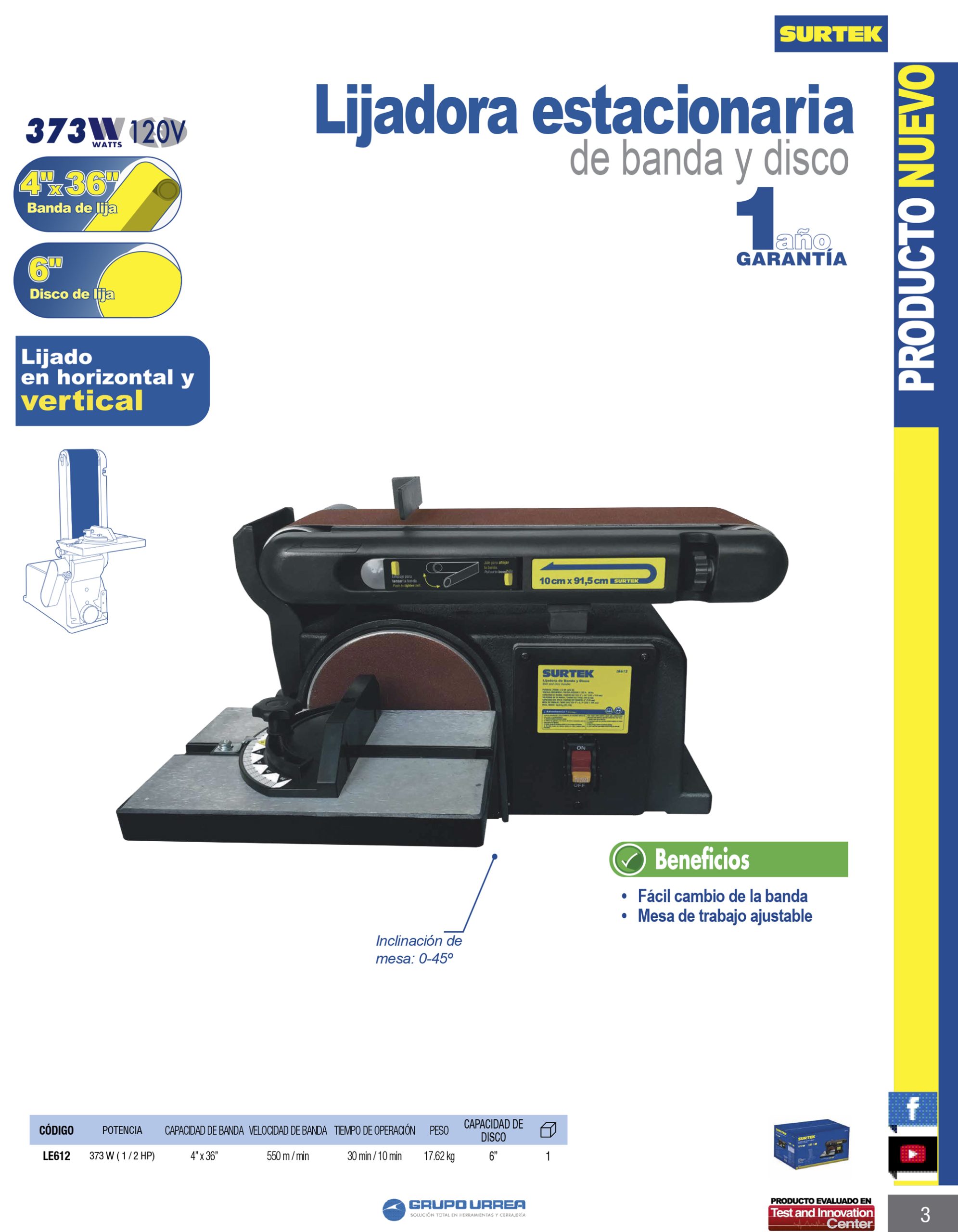 Lijadora de banda 4″ x 36″ y disco estacionaria 6″ 1/2 HP 120 V Surtek