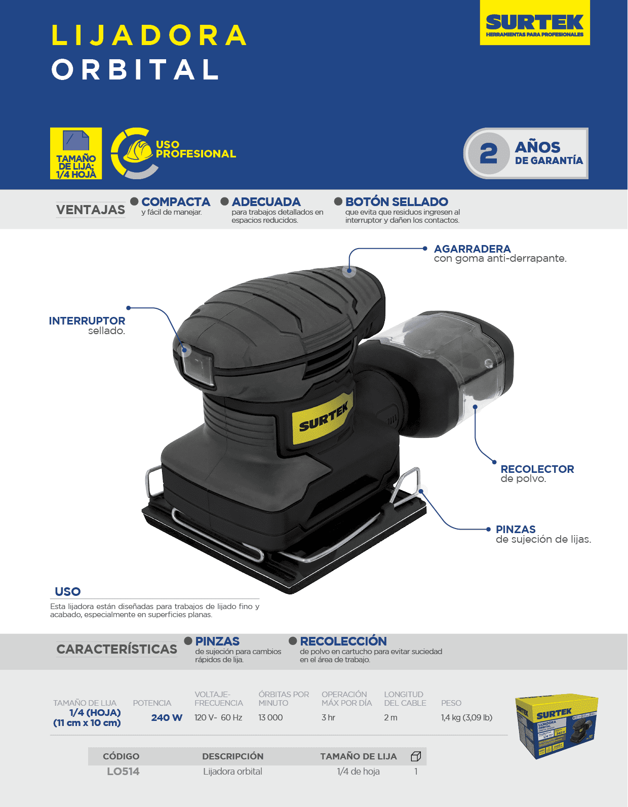 Lijadora orbital 1/4″ 240 W 120 V, 13000 RPM Surtek