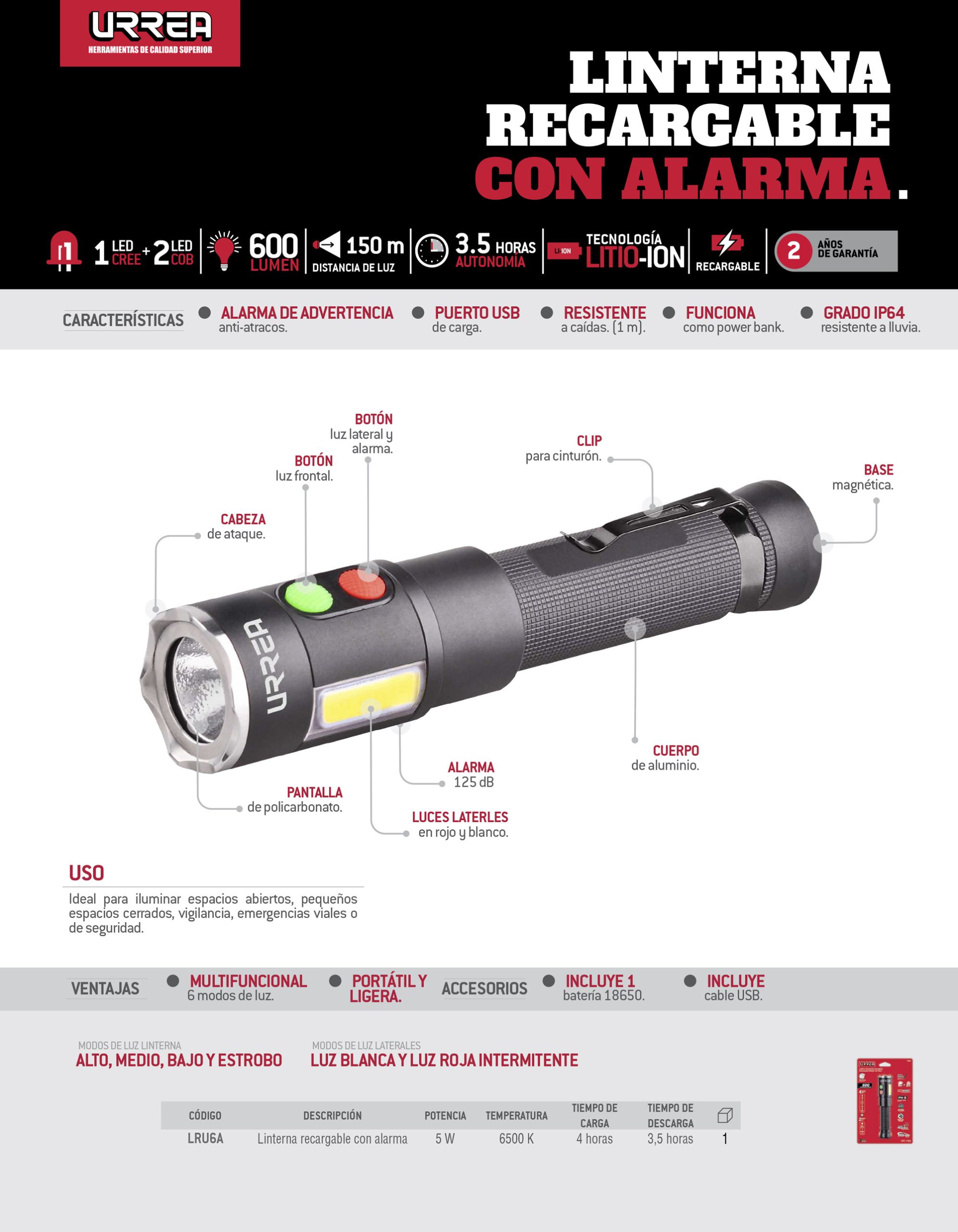 Linterna de LED con alarma recargable de 600 lm Urrea