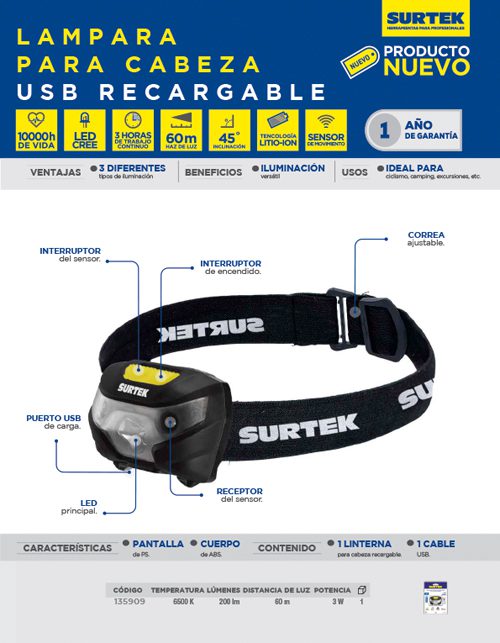 Linterna de LED para cabeza recargable de 200 lm Surtek