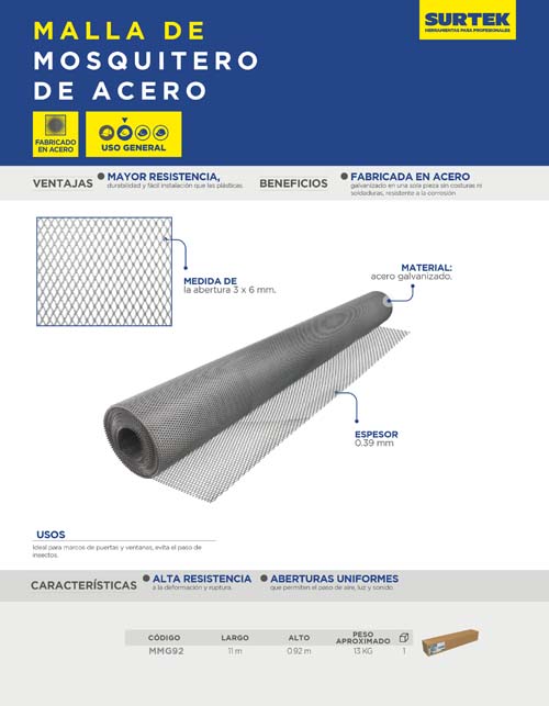 Malla para mosquitero de acero galvanizado 0.92 x 11 m SurtekMalla para mosquitero de acero galvanizado 0.92 x 11 m Surtek