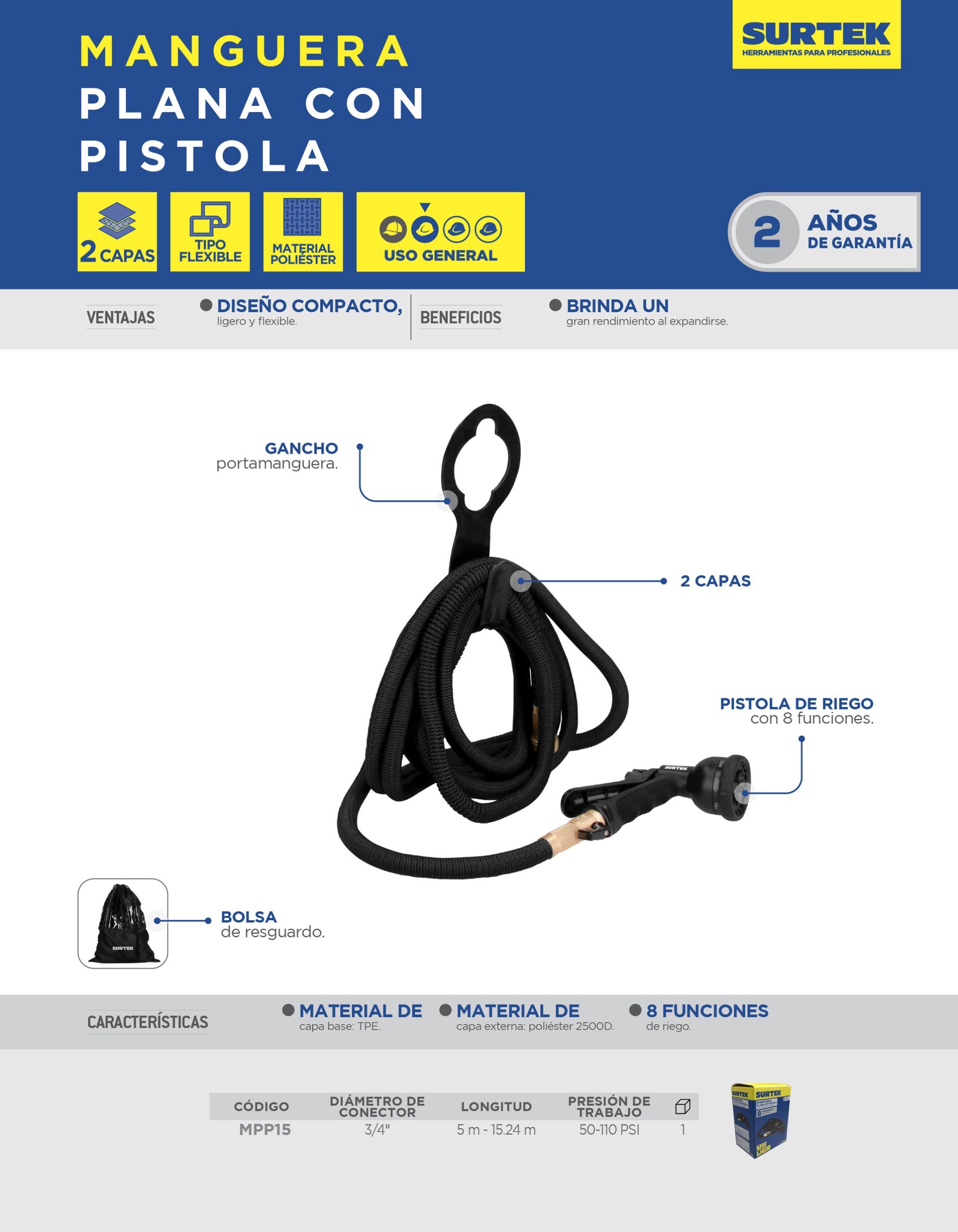 Manguera plana. Gancho porta manguera. Pistola de riego con 8 funciones. Bolsa de resguardo.