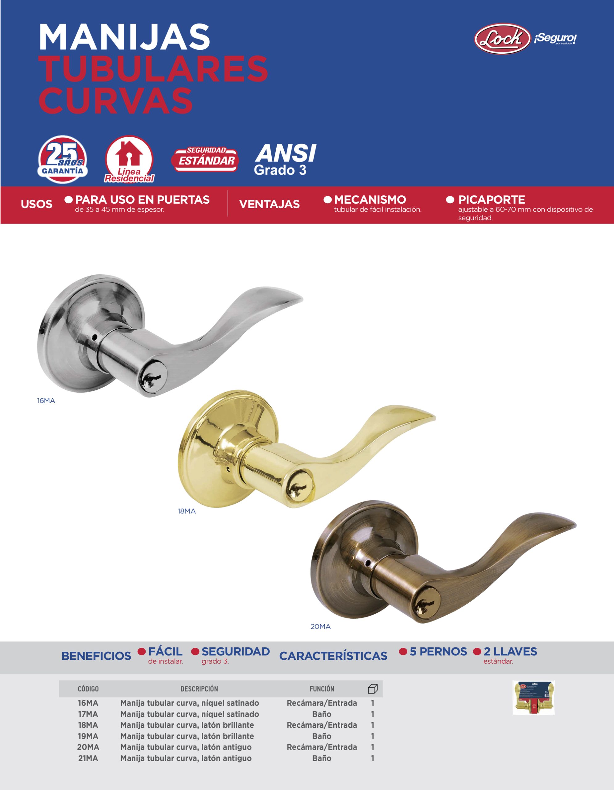 Manija tubular curva función entrada y recámara, latón brillante, llave estándar, blíster Lock