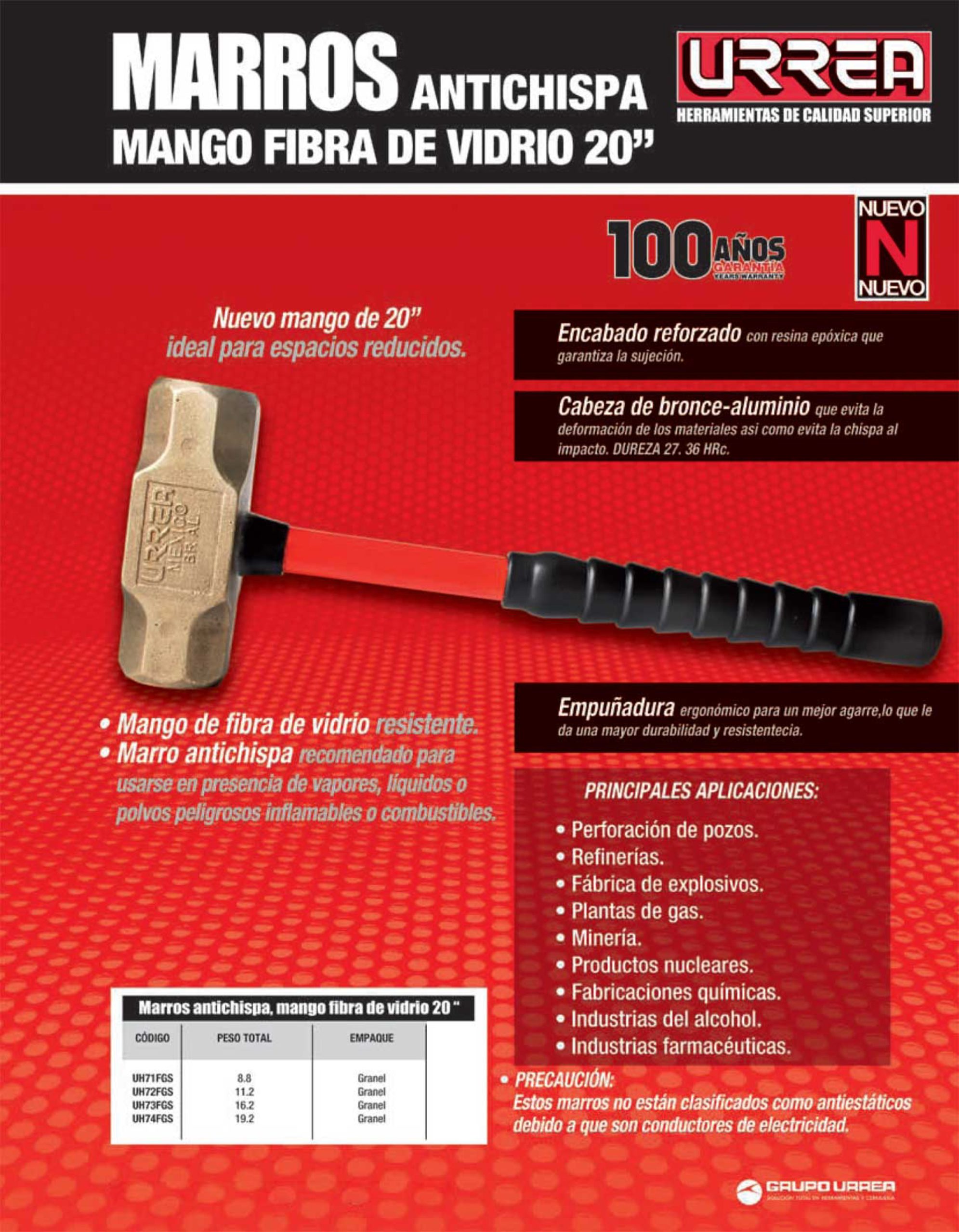 Marro de bronce-aluminio antichispa de 15lb con mango largo de fibra de vidrio 20″ Urrea