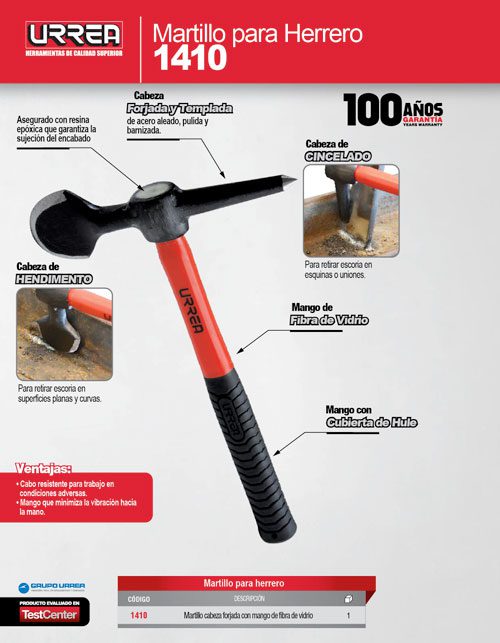 Martilllo para soldador con mango de fibra de vidrio de 12″, 12 oz Urrea