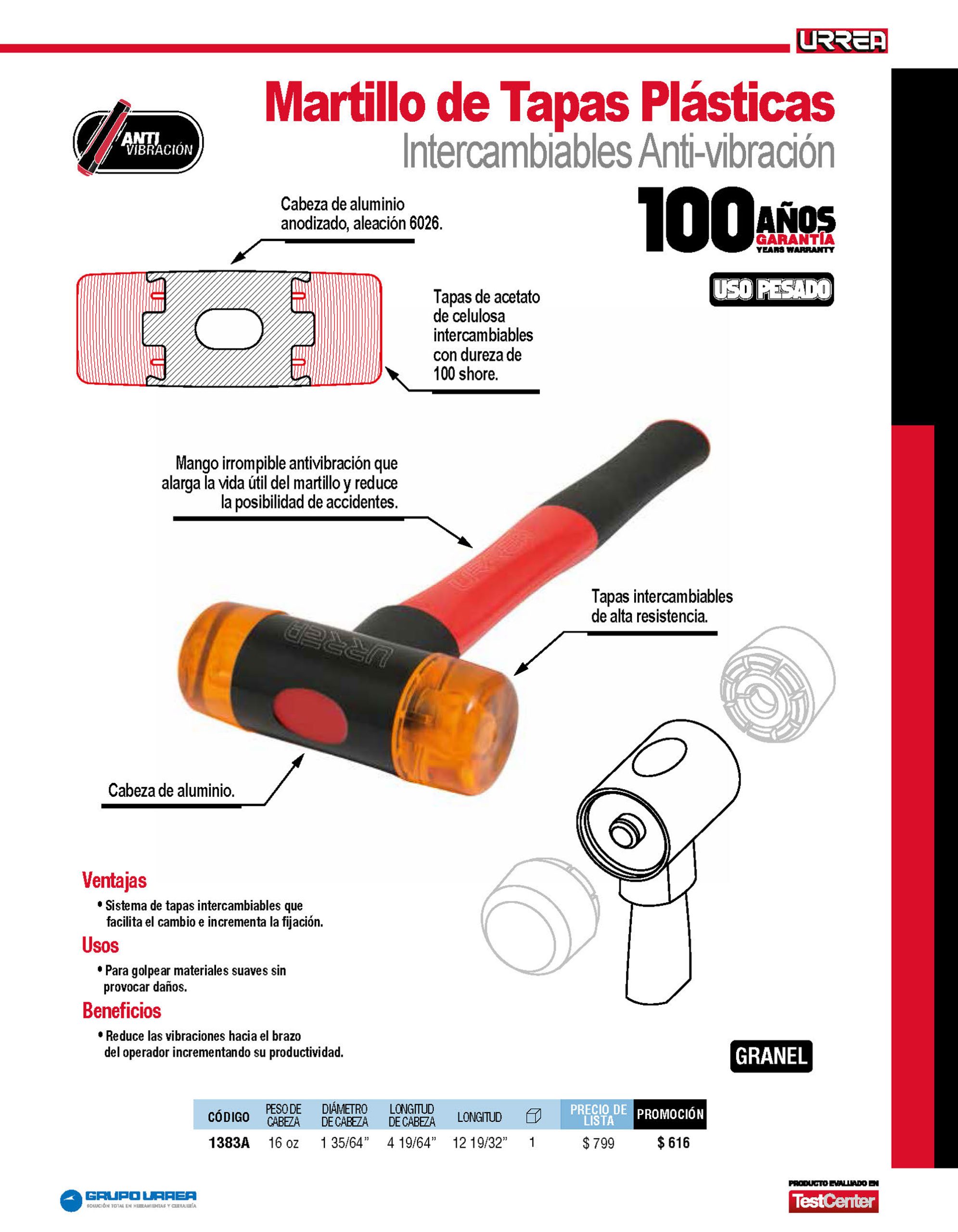 Martillo con tapas plásticas intercambiables con mango anti-vibración, 13 oz Urrea