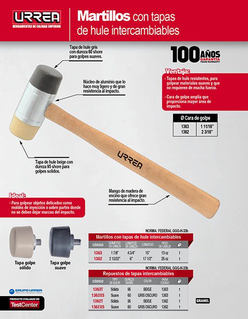 Martillo con tapas plásticas intercambiables con mango de madera de 16″, 13 oz Urrea
