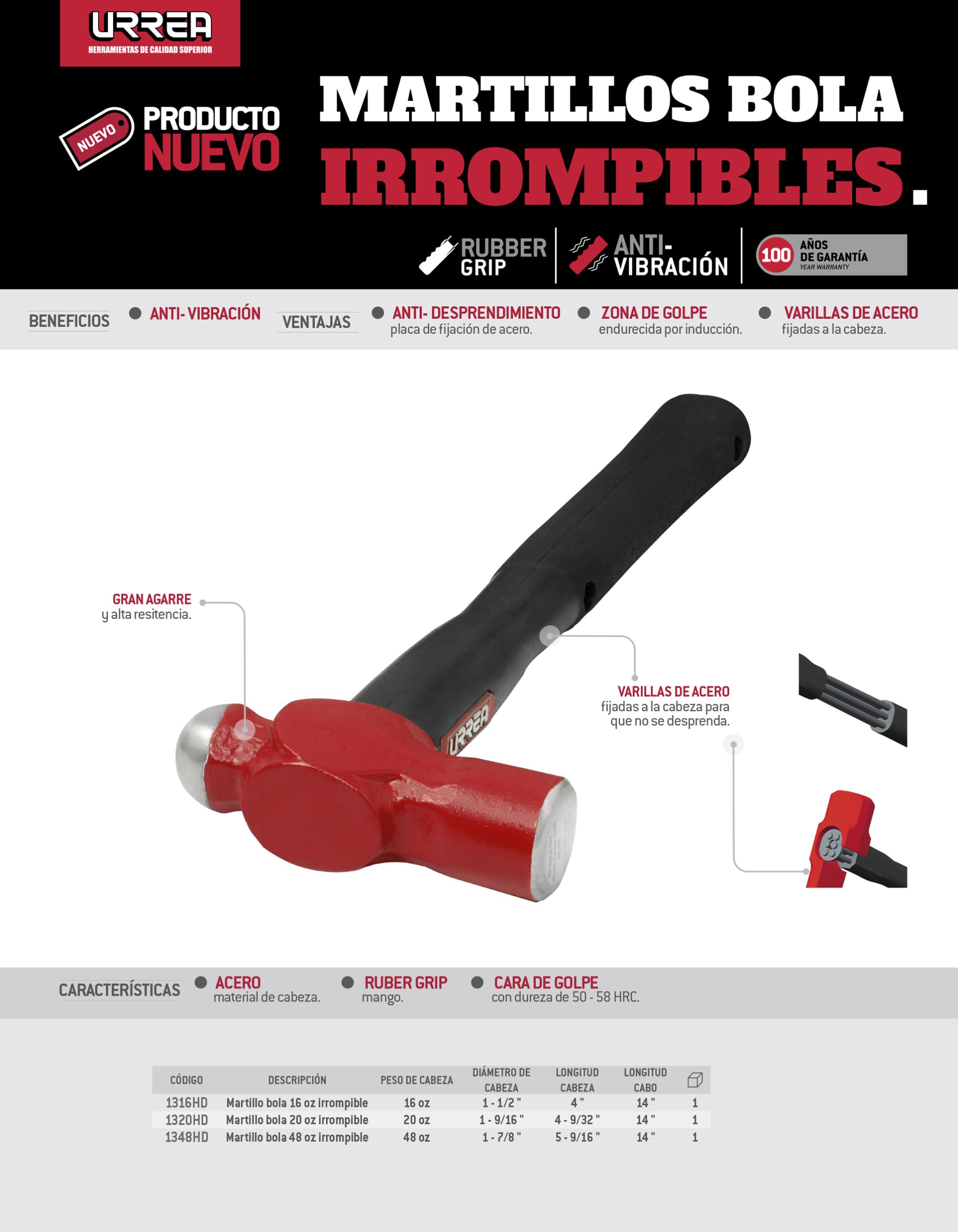 Martillo de bola irrompible con mango Rubber grip de 14″, 20 oz Urrea