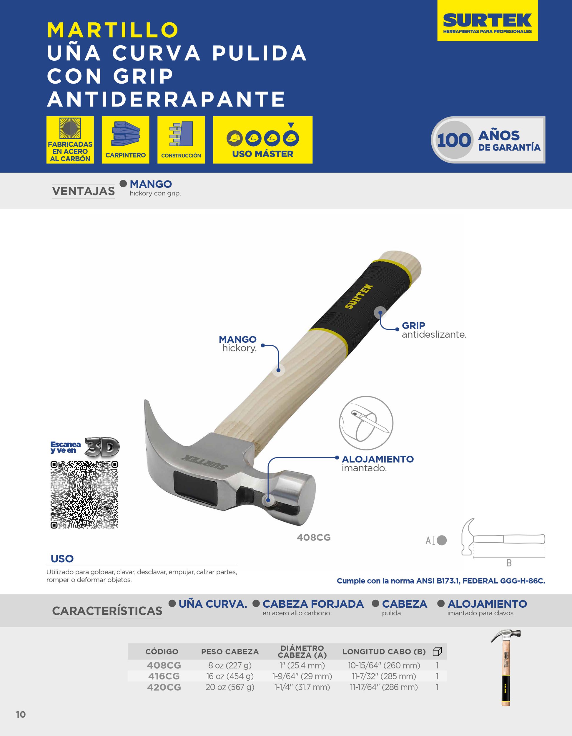 Martillo de uña curva pulido con mango de madera, 20 oz Surtek
