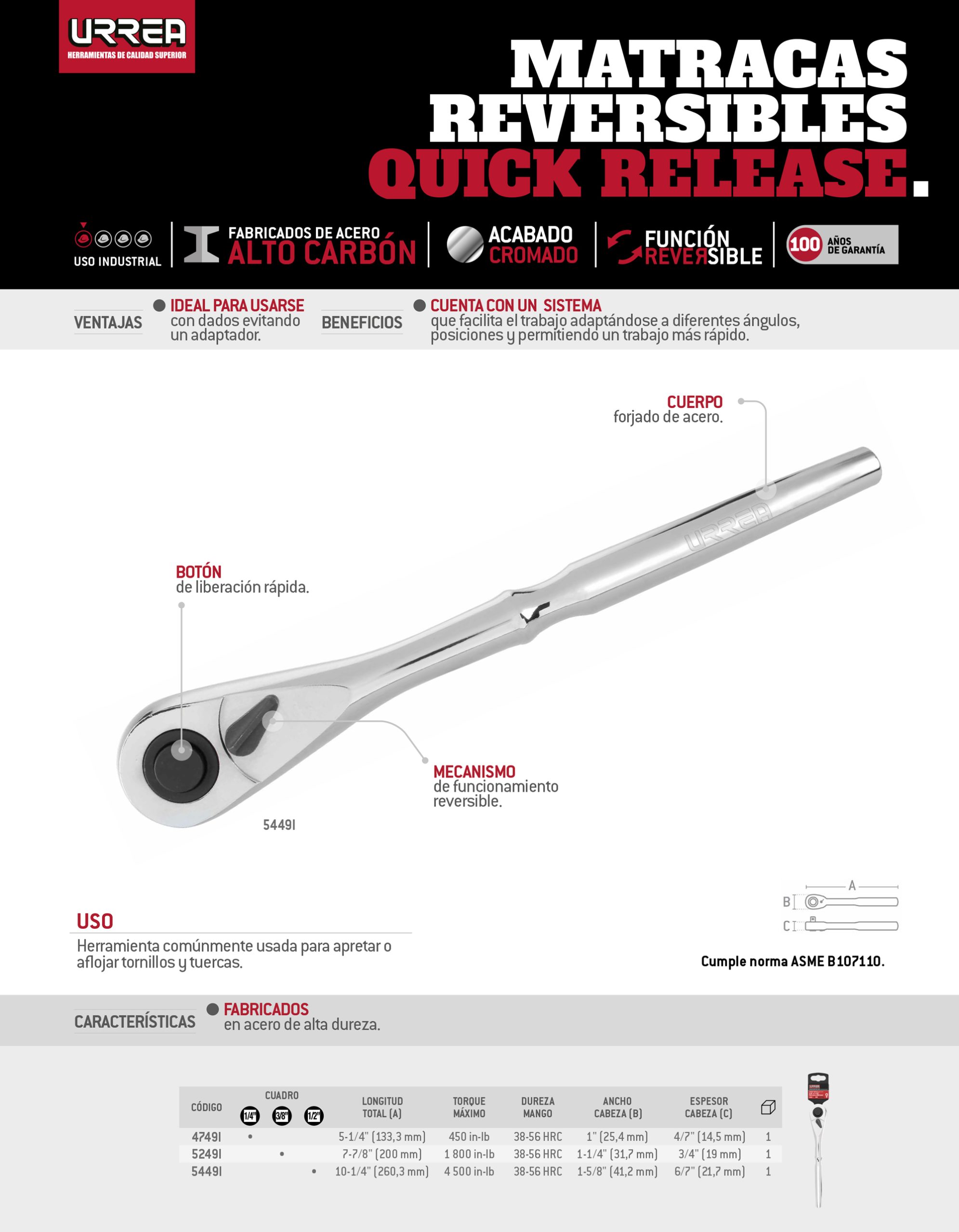 Matraca reversible cromada, quick release, para dado cuadro de 1/2″ Urrea