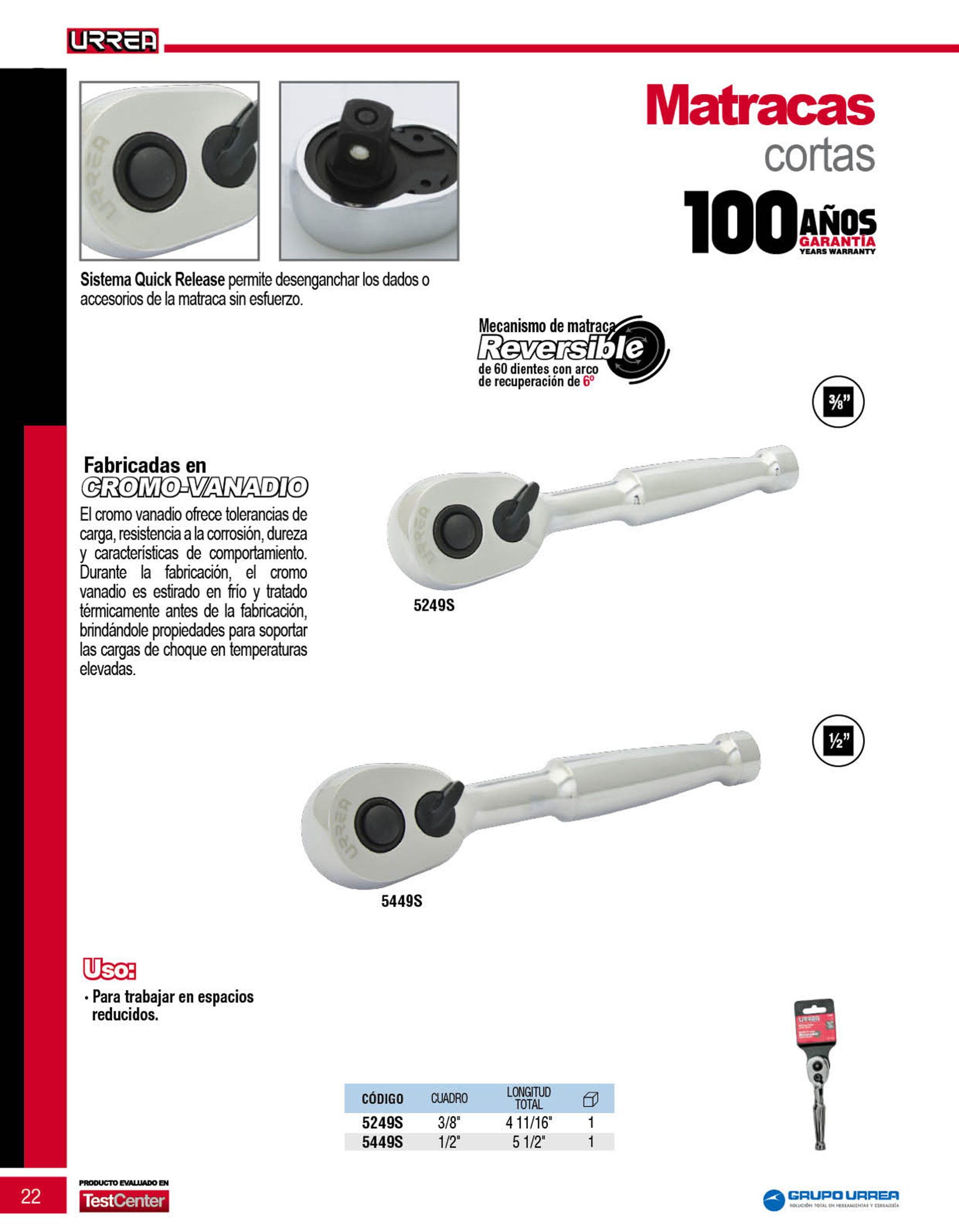 Matraca reversible mango corto, quick release, para dado cuadro de 3/8″ Urrea