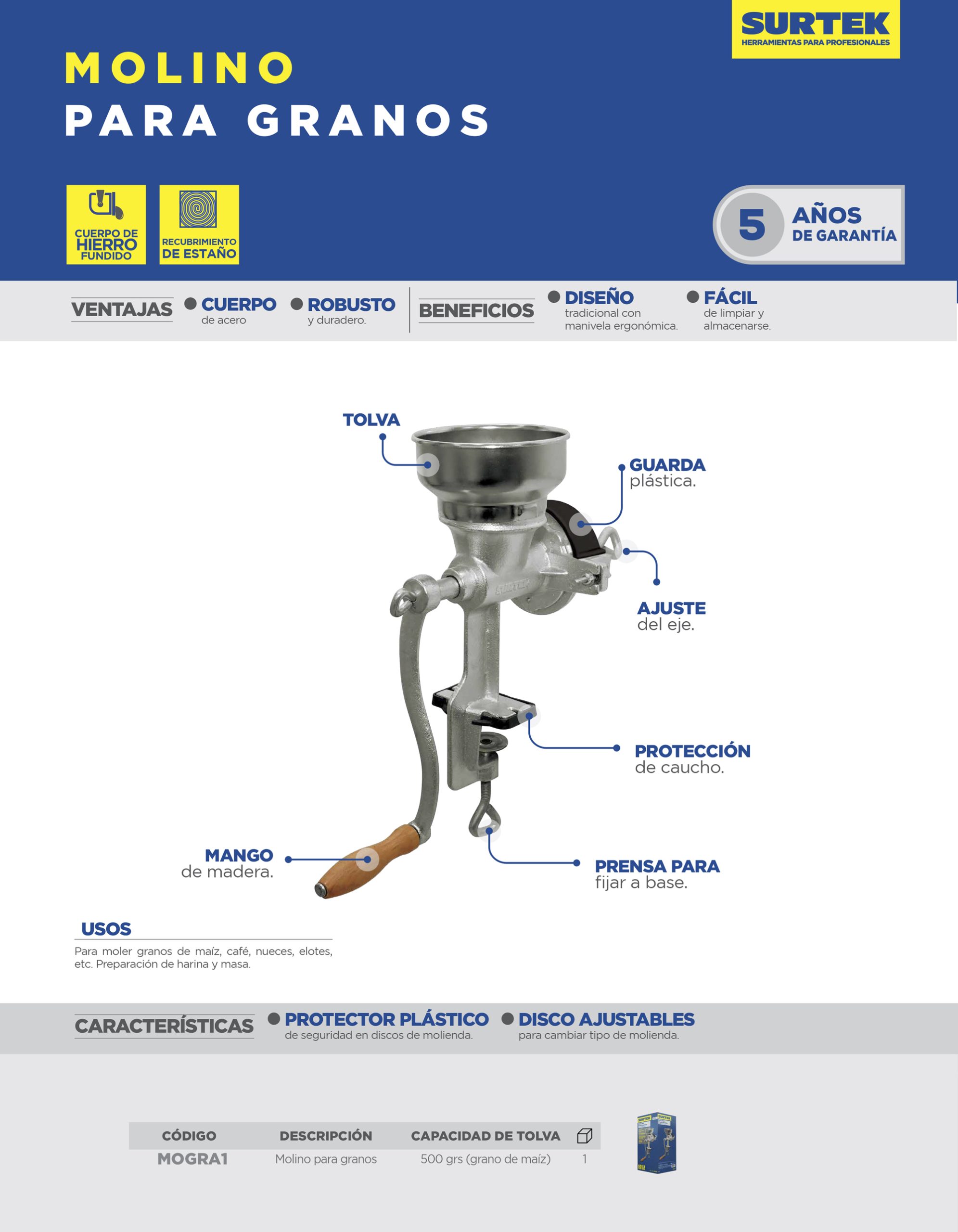 Armella de manivela, Manivela, Cuerpo, Moledor giratorio, Tornillo mariposa, Protector de caucho.