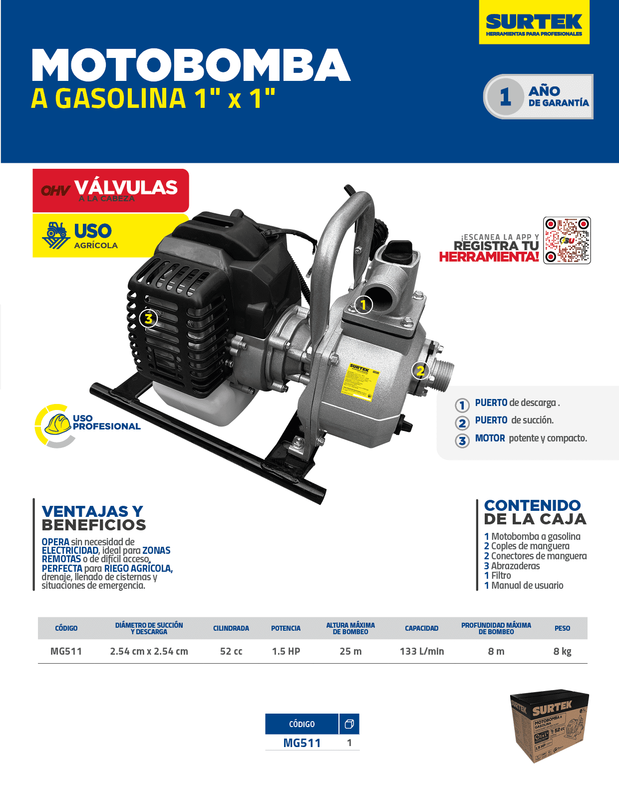 Motobomba a gasolina con diámetro de succión y descarga de 1×1″, 1.5 HP Surtek
