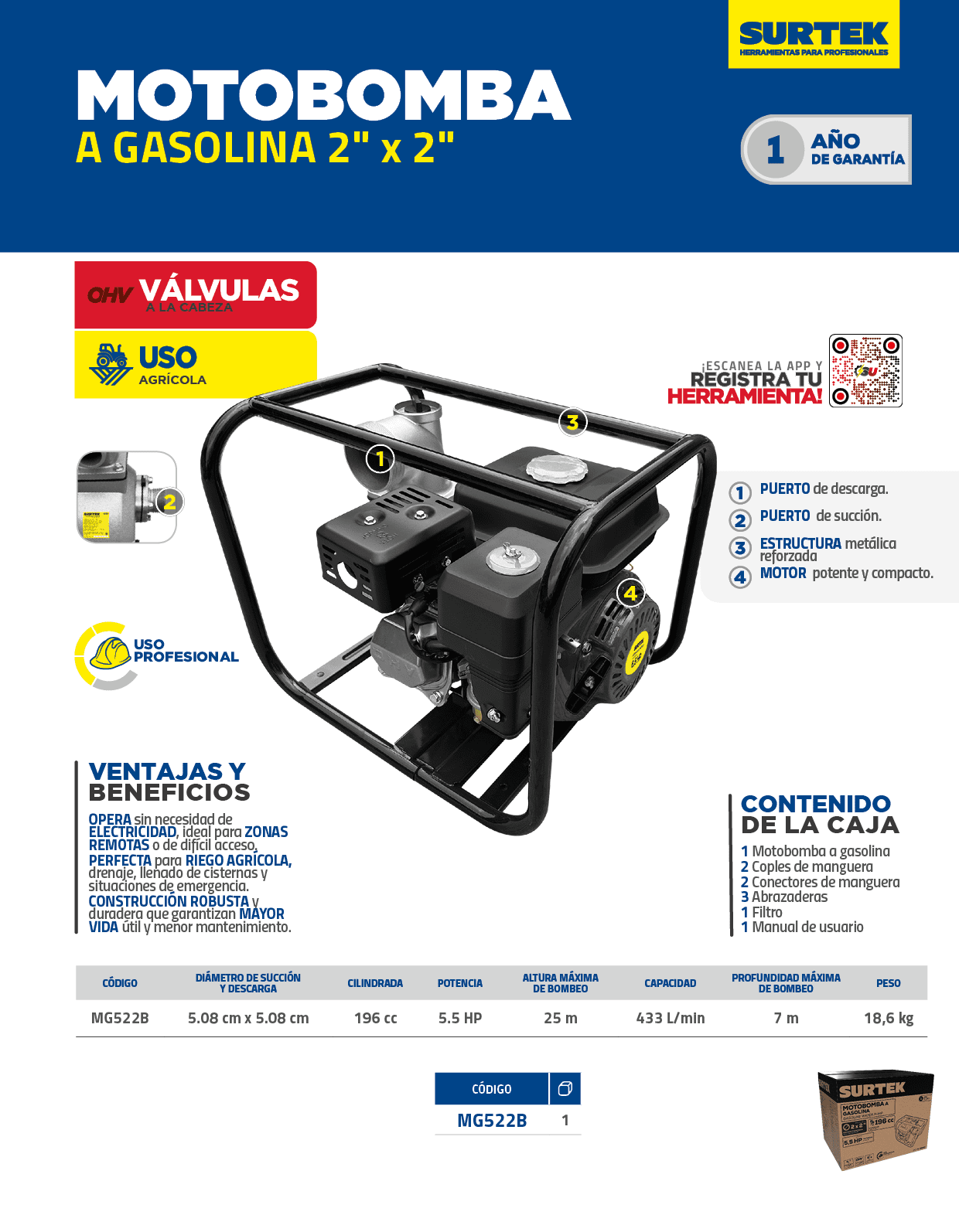 Motobomba a gasolina con diámetro de succión y descarga de 2×2″, 5.5 HP Surtek
