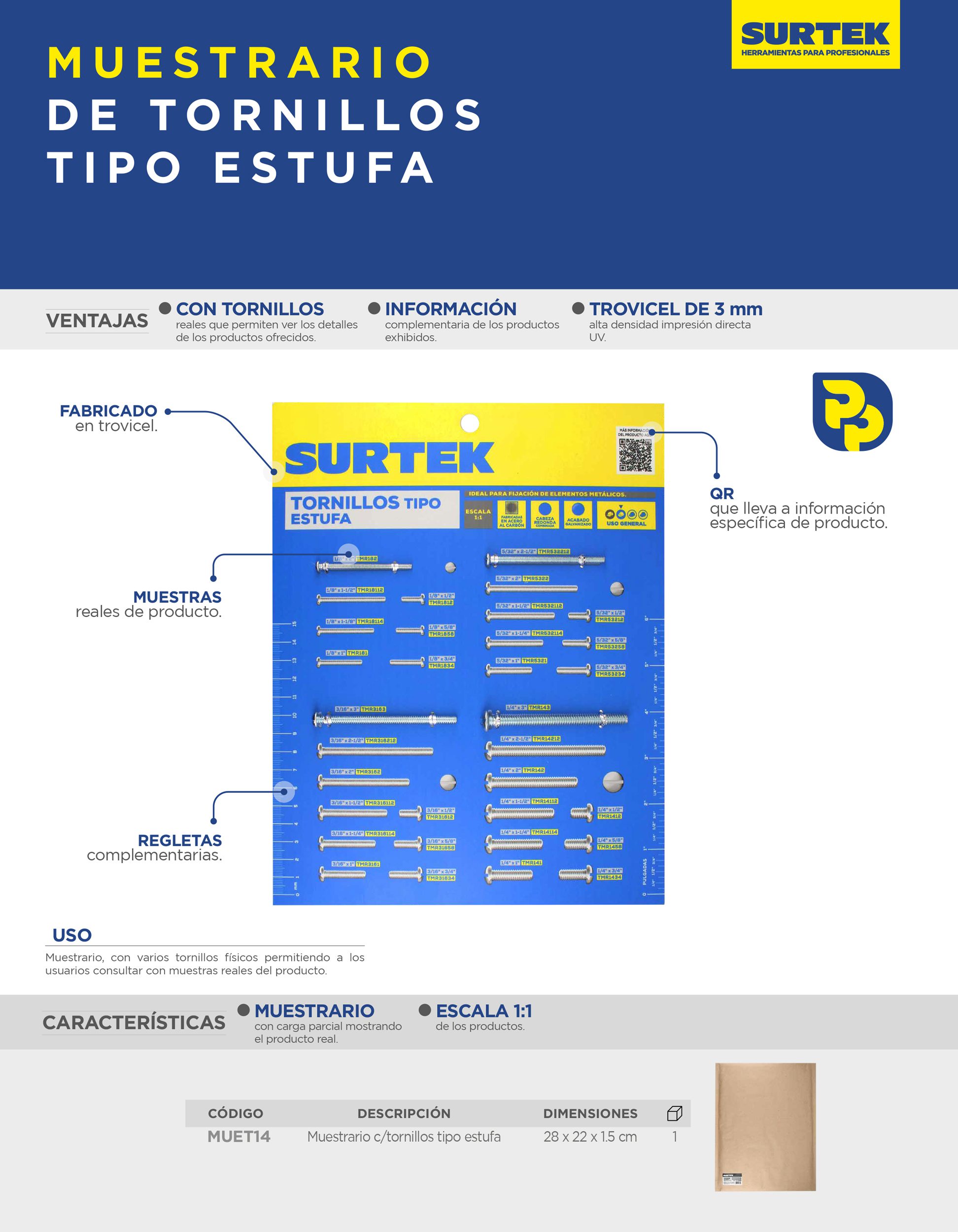 Muestrario de tornillos tipo estufa Surtek