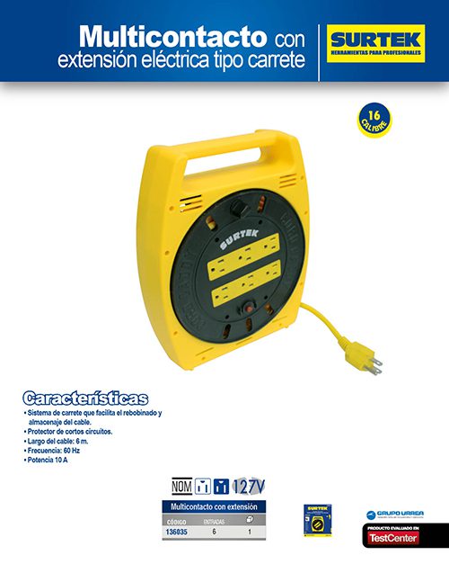 Multicontacto 6 entradas tipo carrete con extensión eléctrica 6 m Surtek