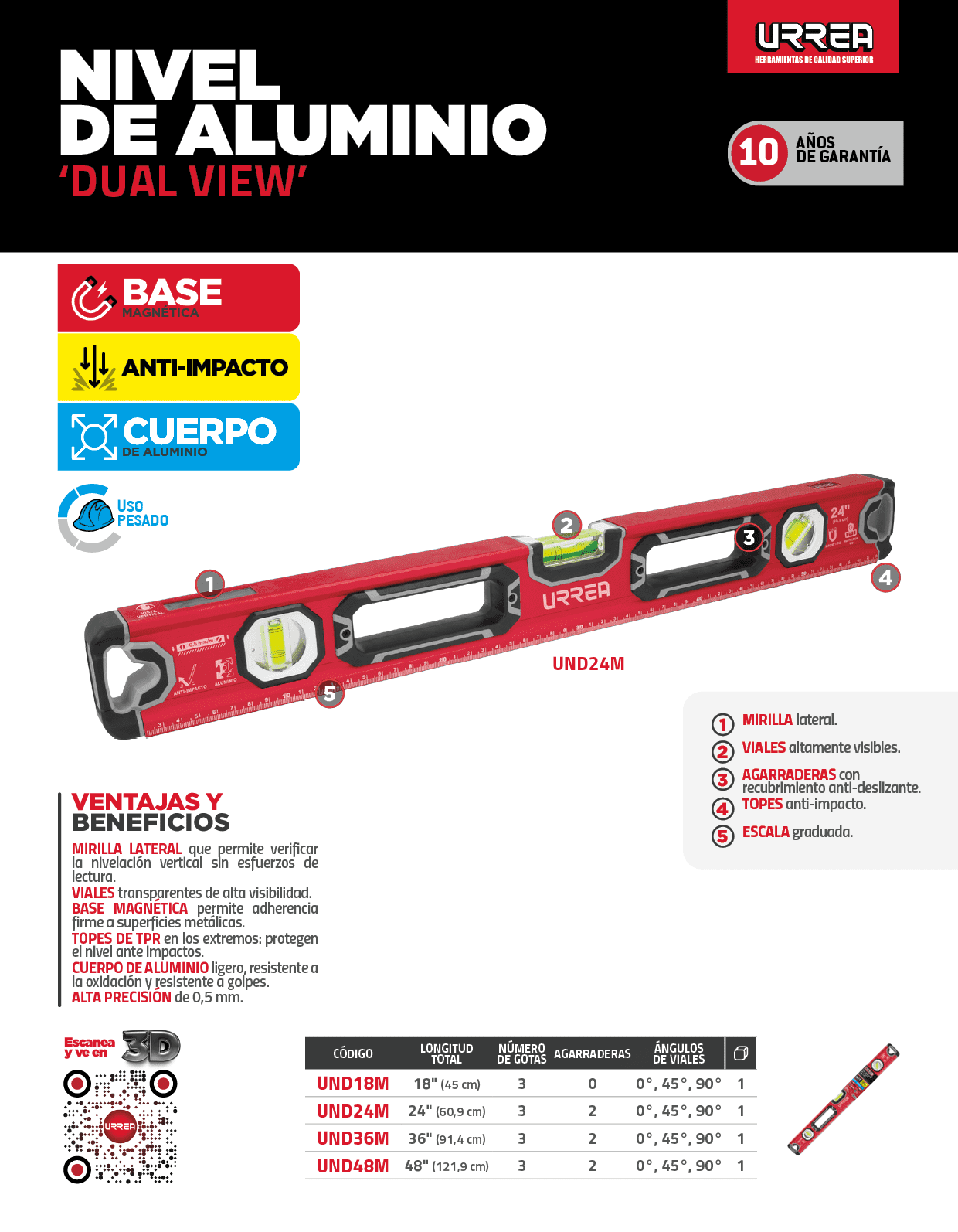 Nivel anti-impacto dual view magnético de aluminio 24″ Urrea