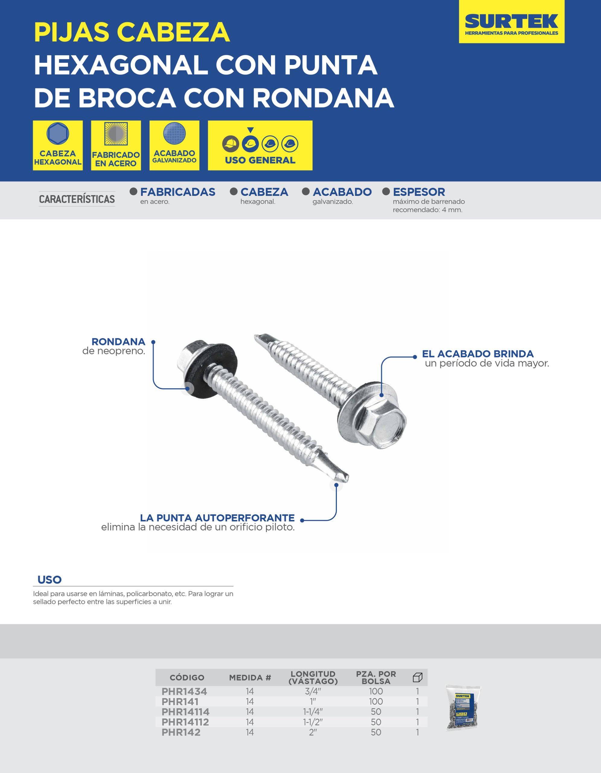 Pija cabeza hexagonal con rondana y punta de broca 3/4" x #14, 100 piezas SurtekPija cabeza hexagonal con rondana y punta de broca 3/4″ x #14, 100 piezas Surtek