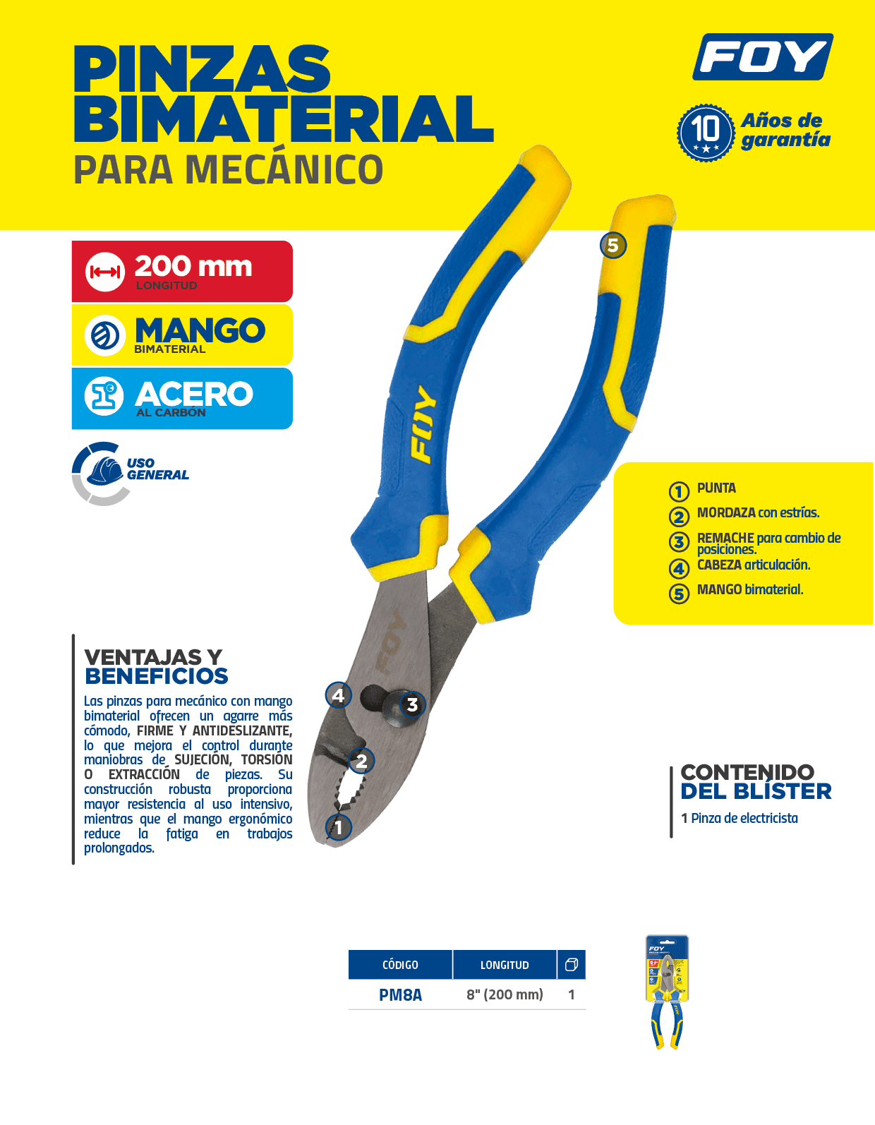 Pinza para mecánico con mango bimaterial de 8″ Foy