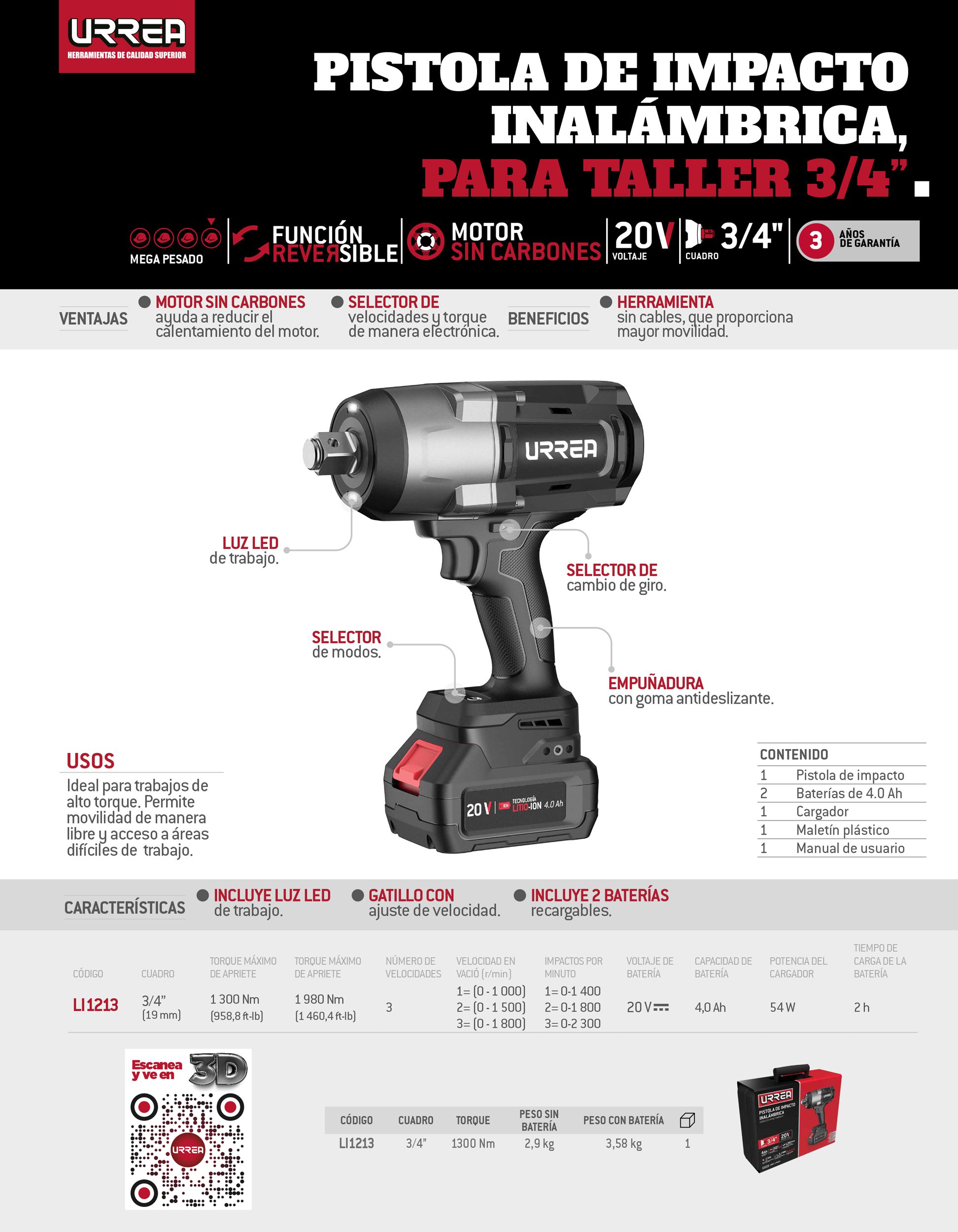 Pistola de impacto 3/4″ a batería Litio-ion 20 V 1300 Nm Urrea