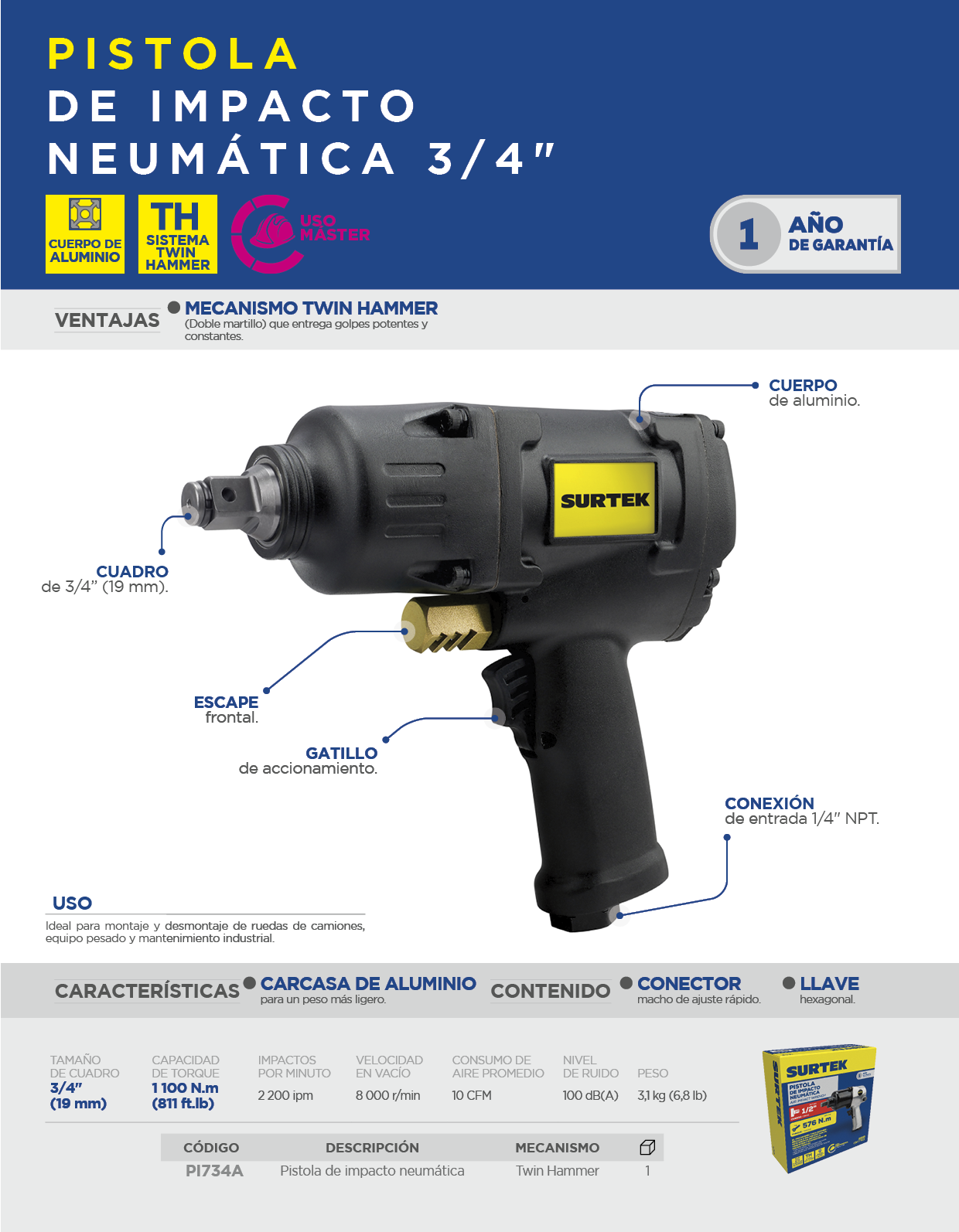 Pistola de impacto neumática cuadro de 3/4″ 800 Ft-lb sistema twin hammer Surtek