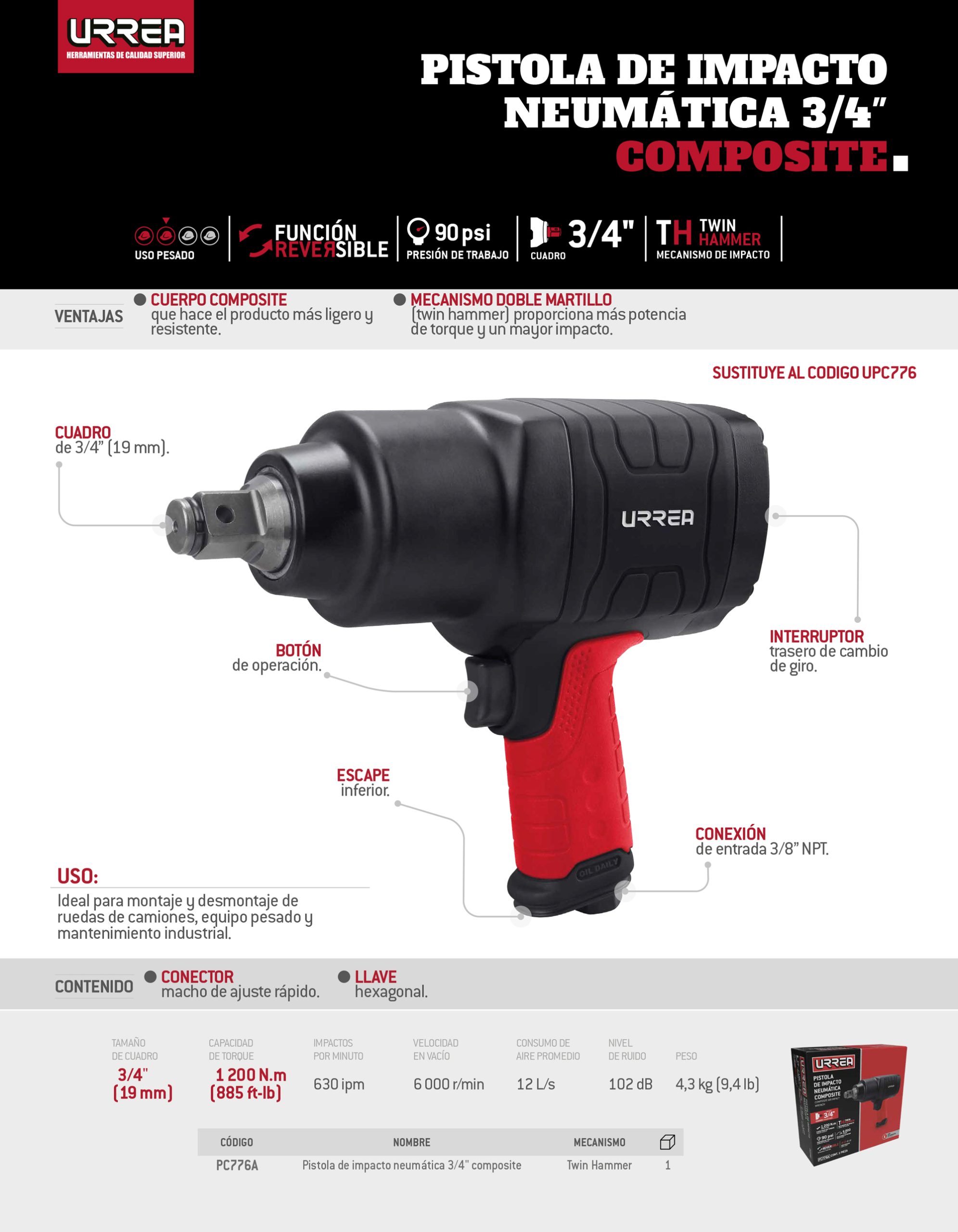 Pistola de impacto neumática cuadro de 3/4″ 885 Ft-lb composite sistema twin hammer Urrea