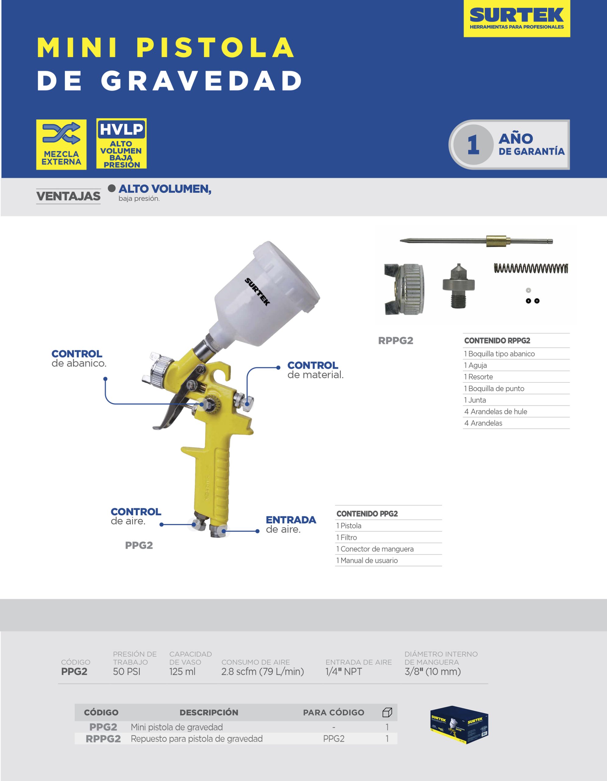 Pistola para pintar terminados baja presion, capacidad 125 ml, 50 PSI Surtek