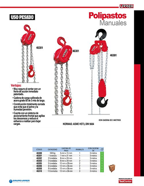 Polipasto manual con freno de acción inmediata 1 ramal, 1 ton, cadena 3 m Urrea