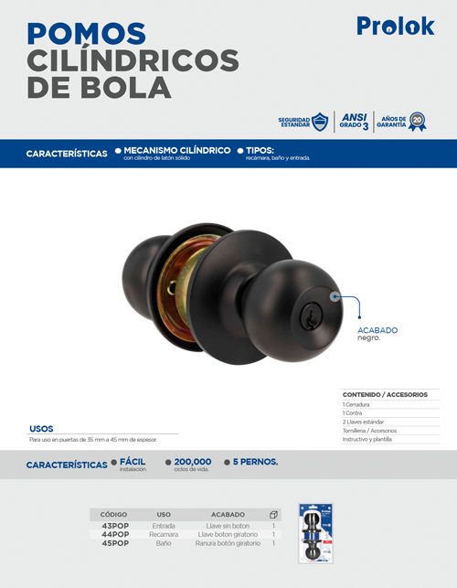 -2 Llaves estándar. Incluye accesorios de instalación. Cilindro de latón. 200,000 ciclos.