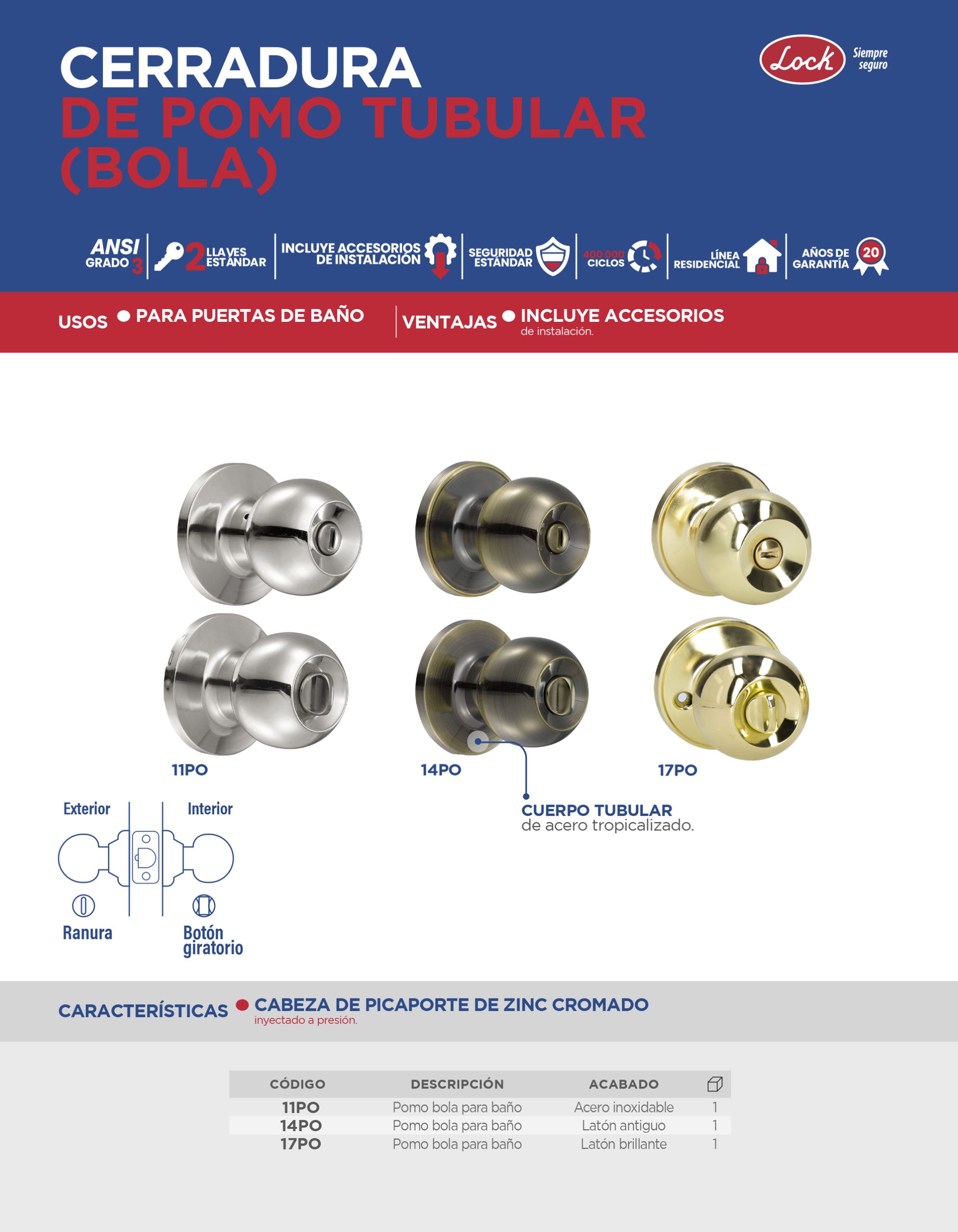 Pomo tubular bola función baño, latón brillante, blíster Lock