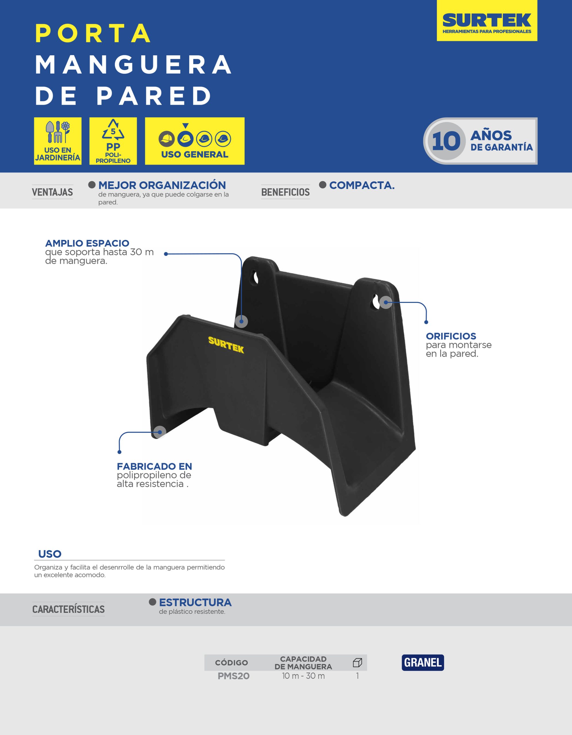 Porta manguera de pared plástico, capacidad de 20 m Surtek
