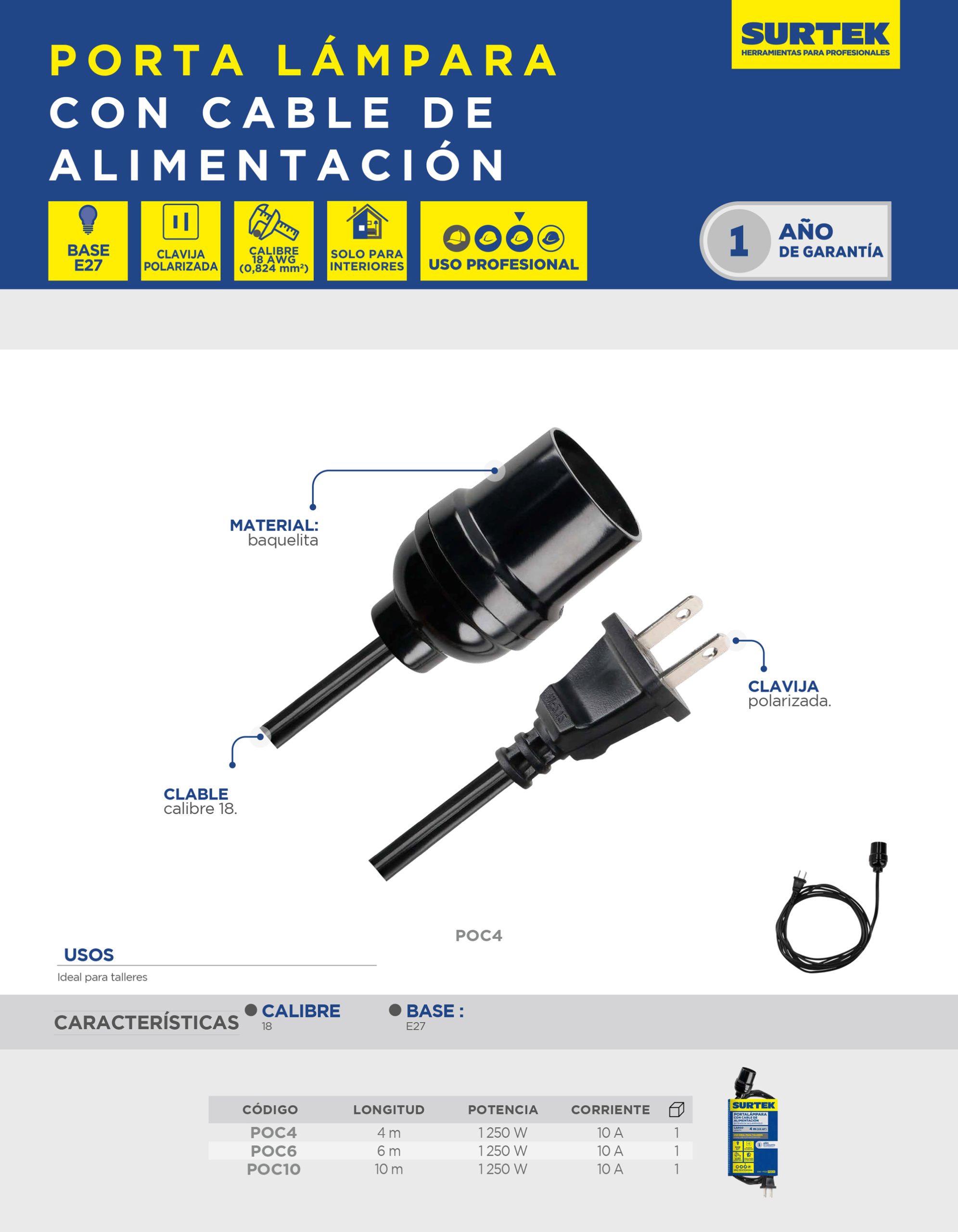 Portalámpara con cable de alimentación 2 x 18 4 m Surtek