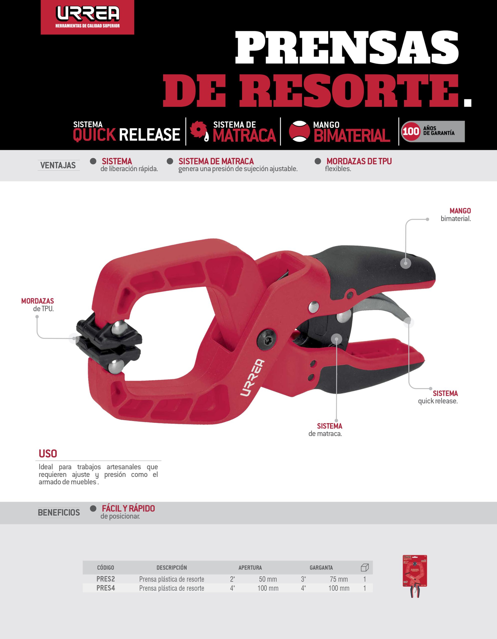 Prensa plástica de resorte 2″, Quick Release Urrea