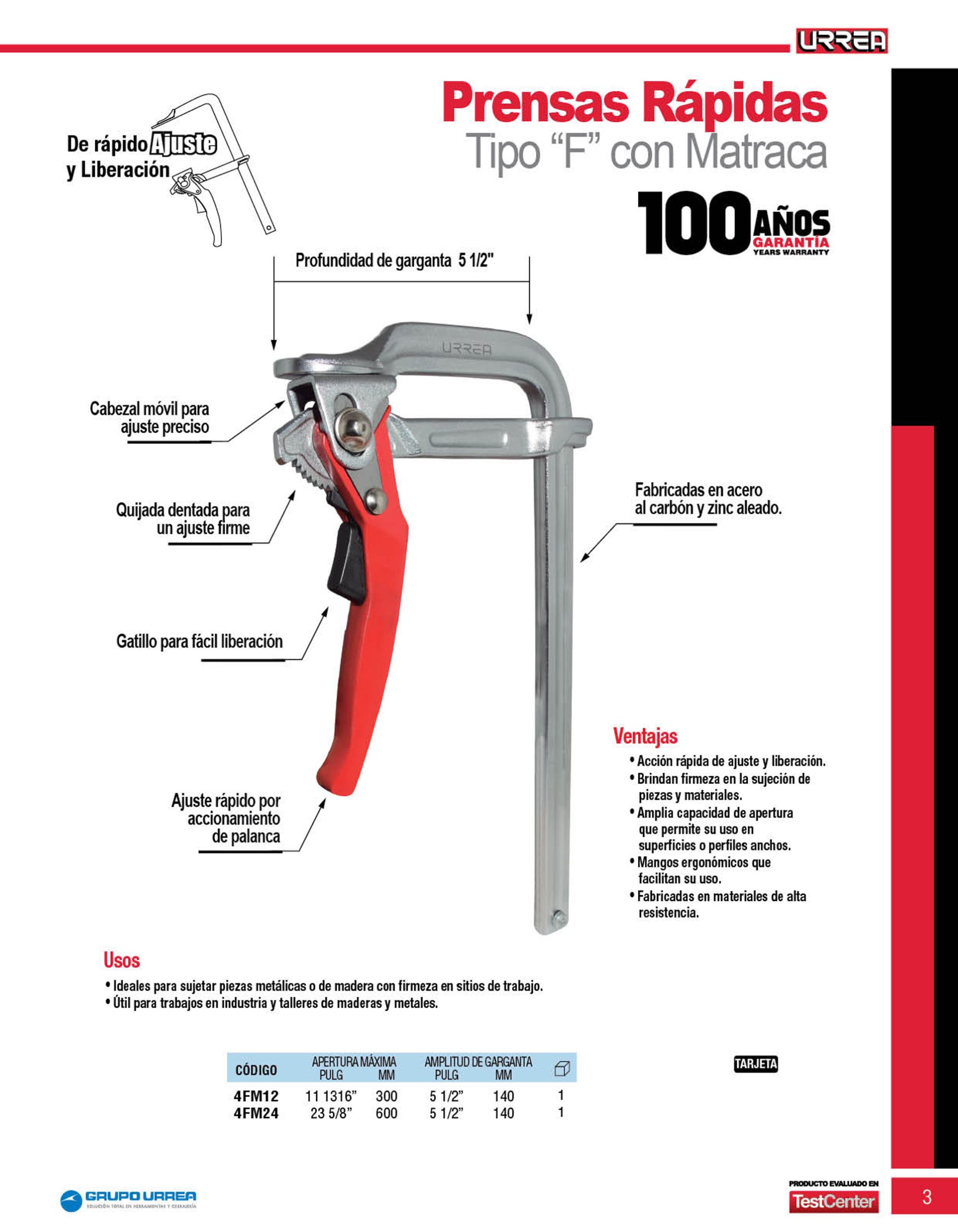 Prensa rápida o tipo “F” con matraca 23 1/2″ x 5 1/2″ Urrea