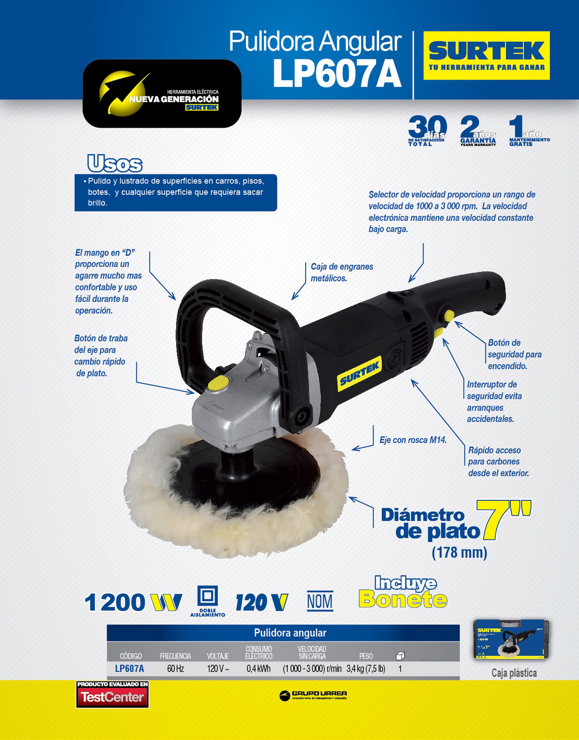 Pulidora angular 7″ 1200 W 120 V, 600 – 3000 RPM Surtek