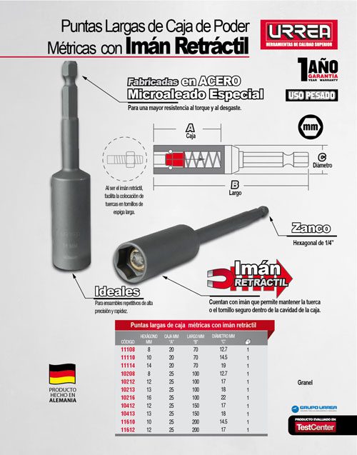 Punta de caja de poder con imán retráctil métrica hexágono de 1/4″, 12 x 100 mm Urrea