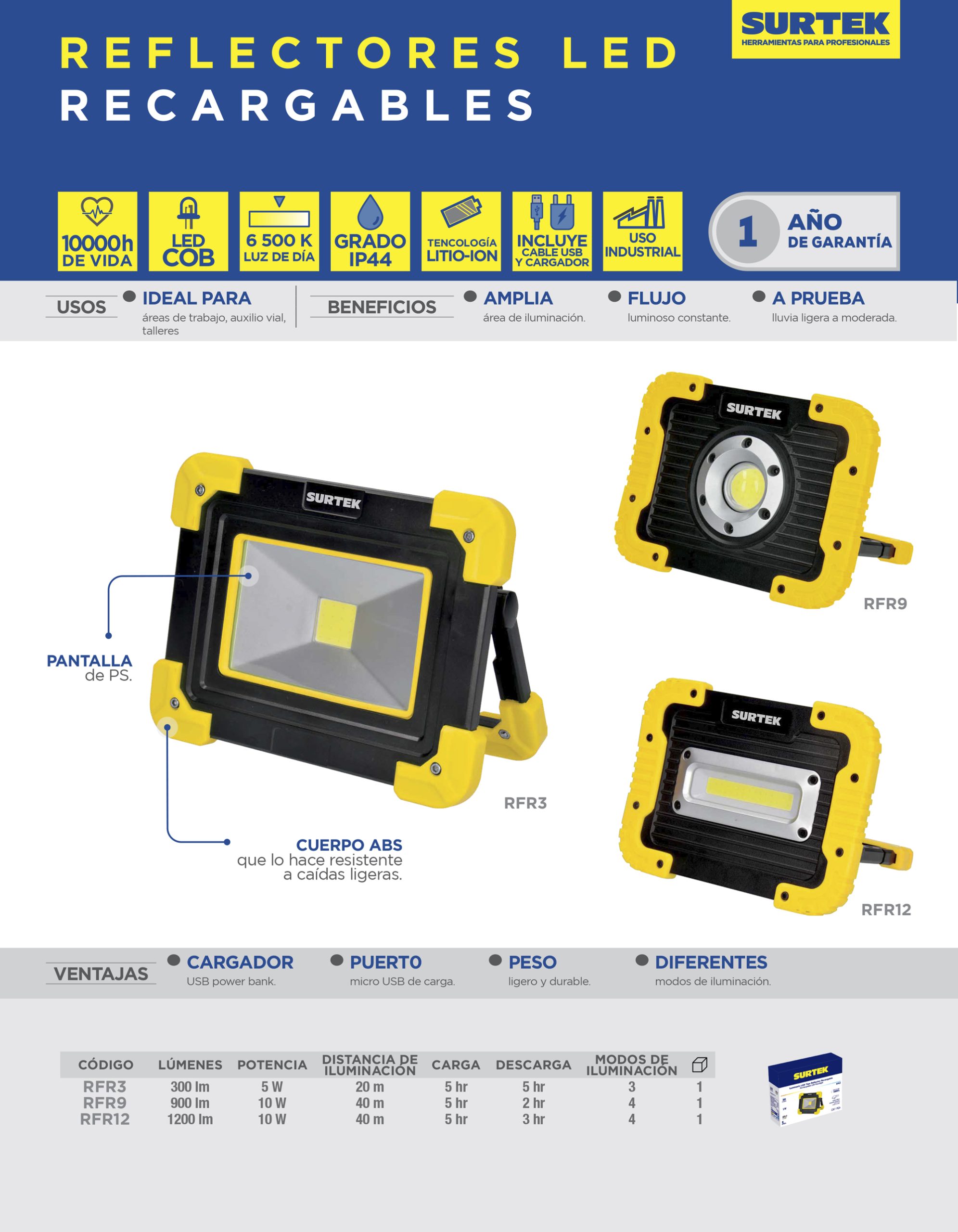 Reflector de LED recargable 12 W de 1,200 lm Surtek