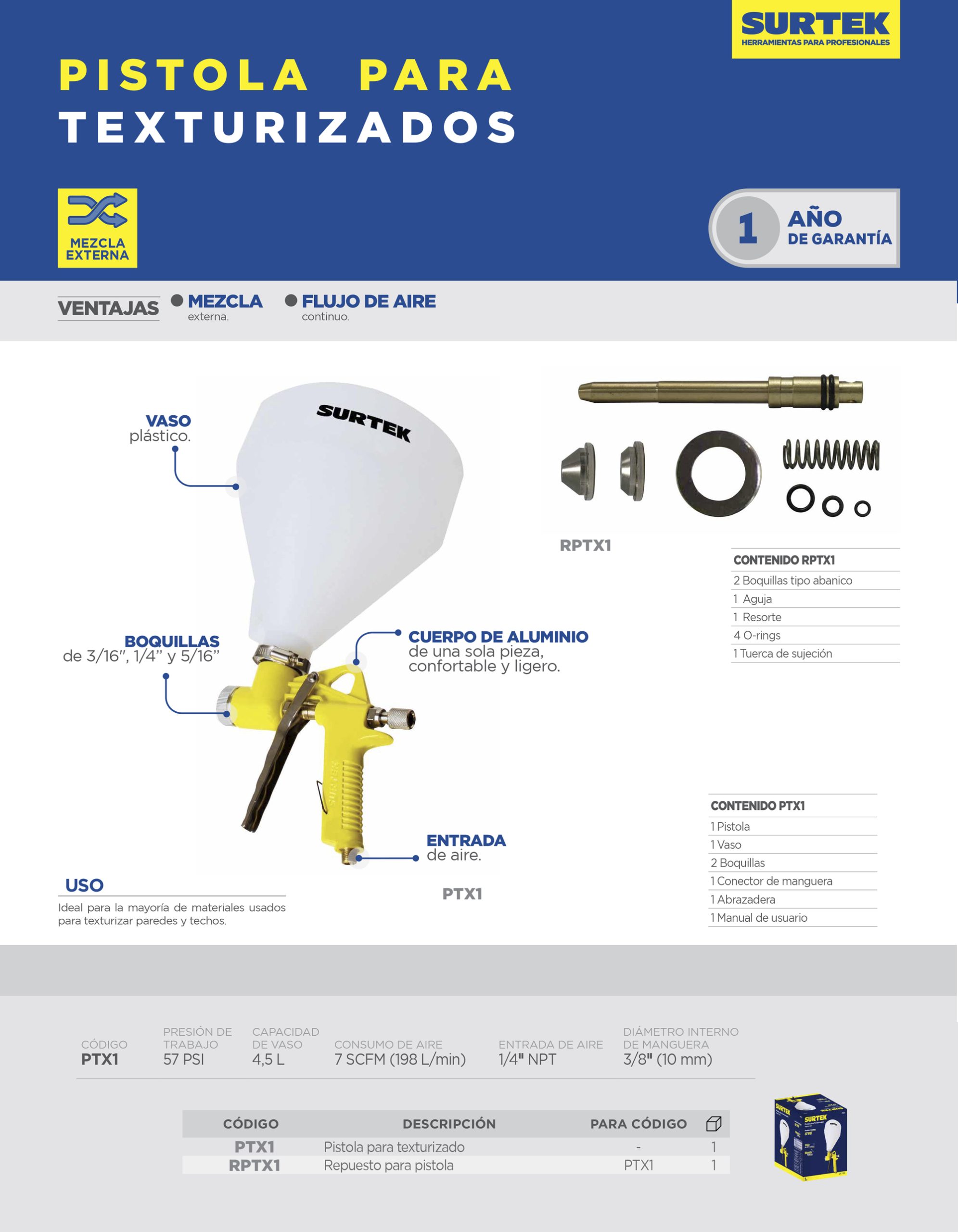 2 boquillas tipo abanico, 1 aguja, 1 resorte, 4 o’rings, 1 tuerca de sujeción.