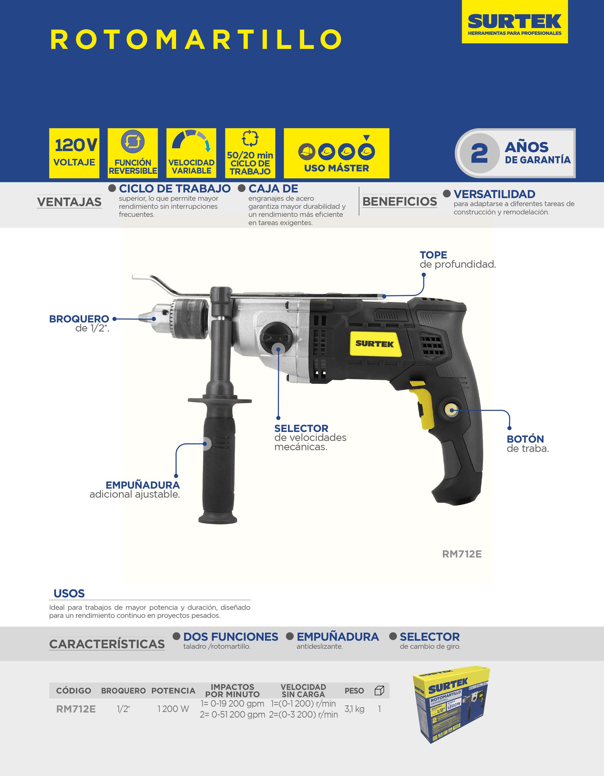 Rotomartillo 1/2″ 1200 W 127 V, 0 – 3,200 RPM con botón de traba para trabajos continuos Surtek