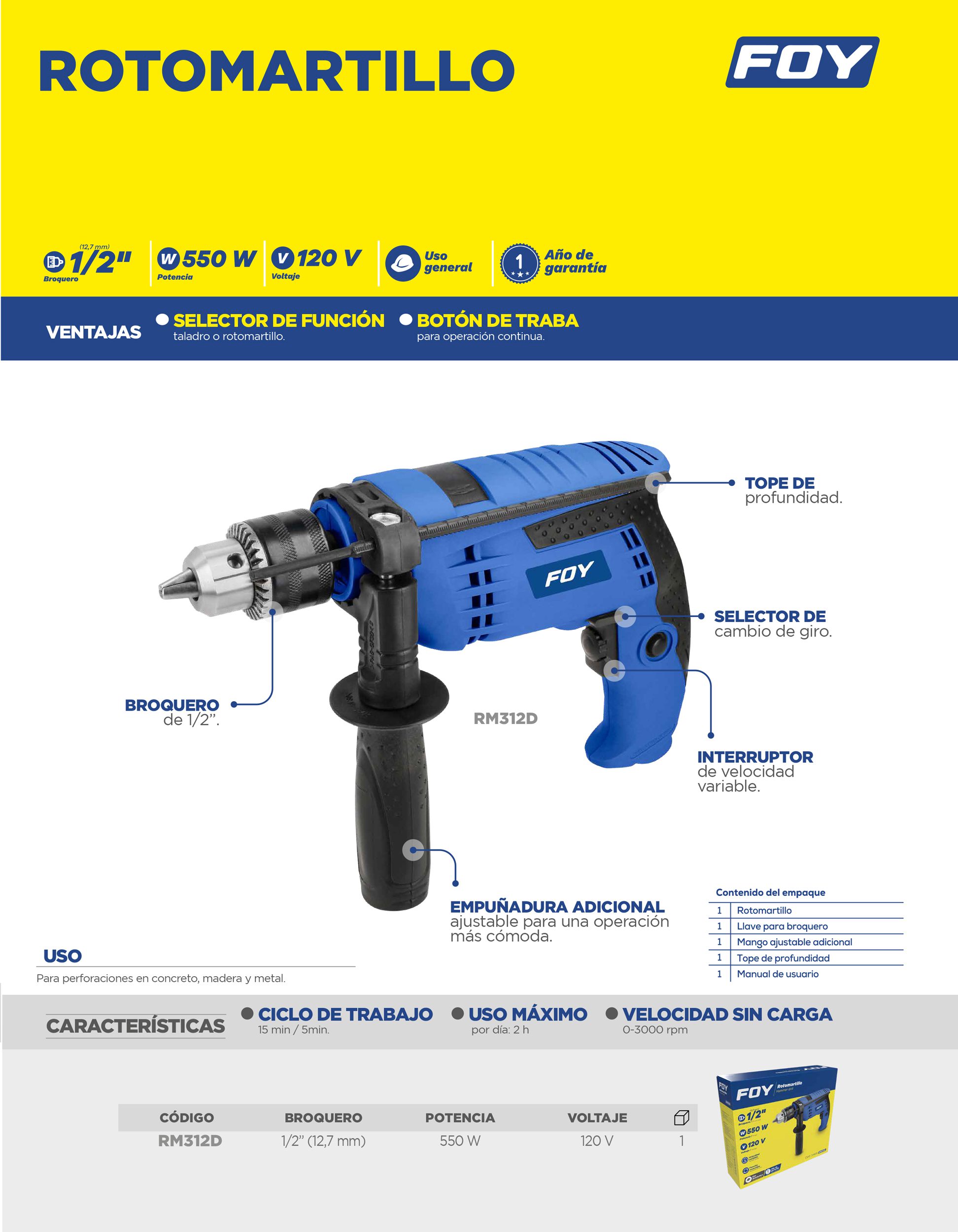 Rotomartillo 1/2″ 550 W, 120 V, 0 – 3000 RPM con mango adicional ajustable Foy