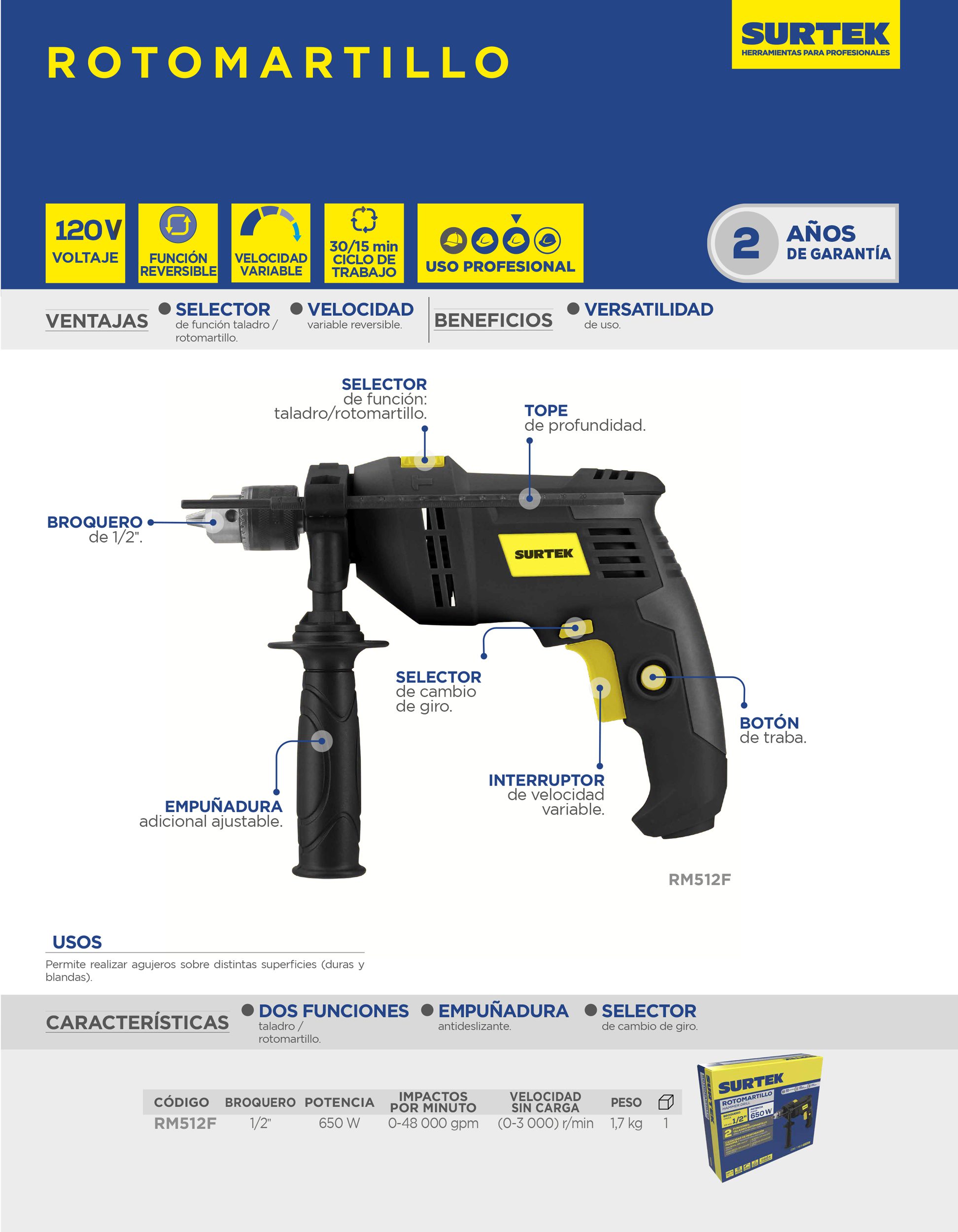 Rotomartillo 1/2″ 650 W 127 V, 0 – 3,000 RPM con botón de traba para trabajos continuos Surtek