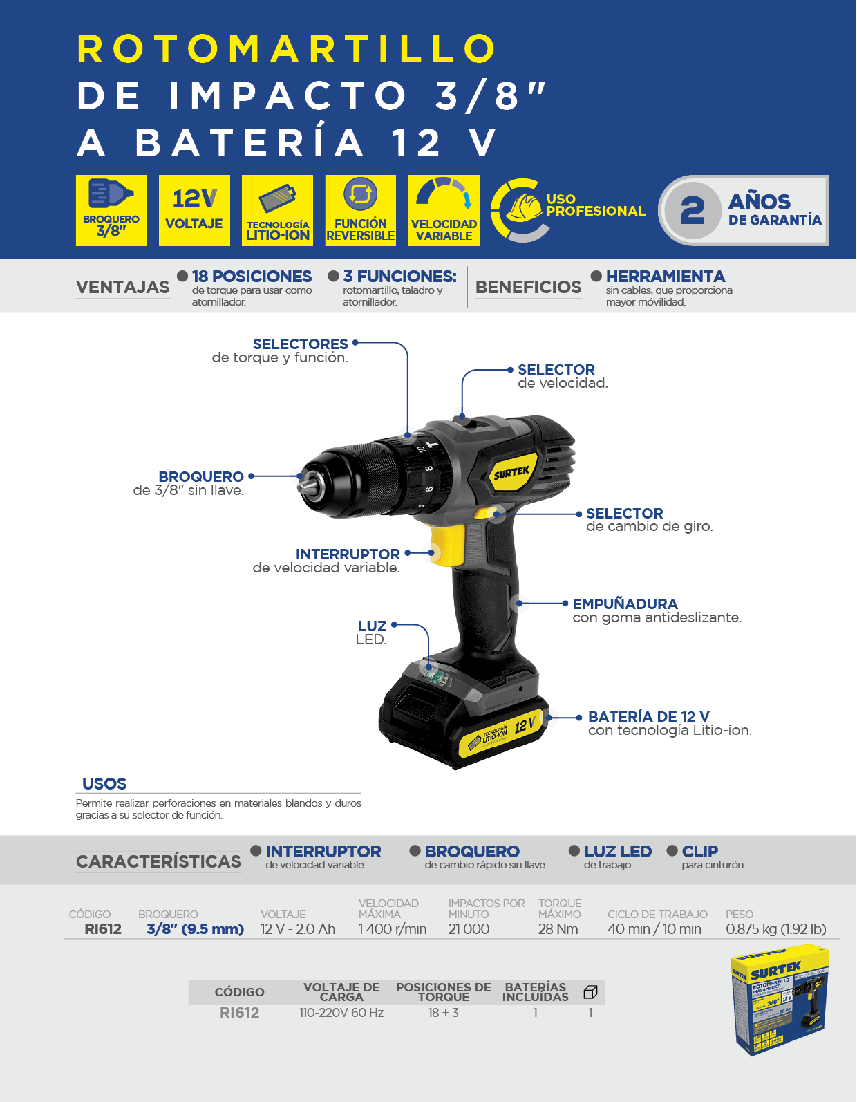 Rotomartillo de imp 3/8″ a batería Litio-ion 12 V 28 Nm Surtek