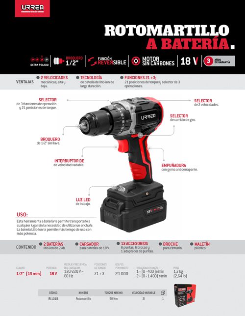 Rotomartillo de impacto 1/2″ a batería Litio-ion 18 V, 50 Nm Urrea