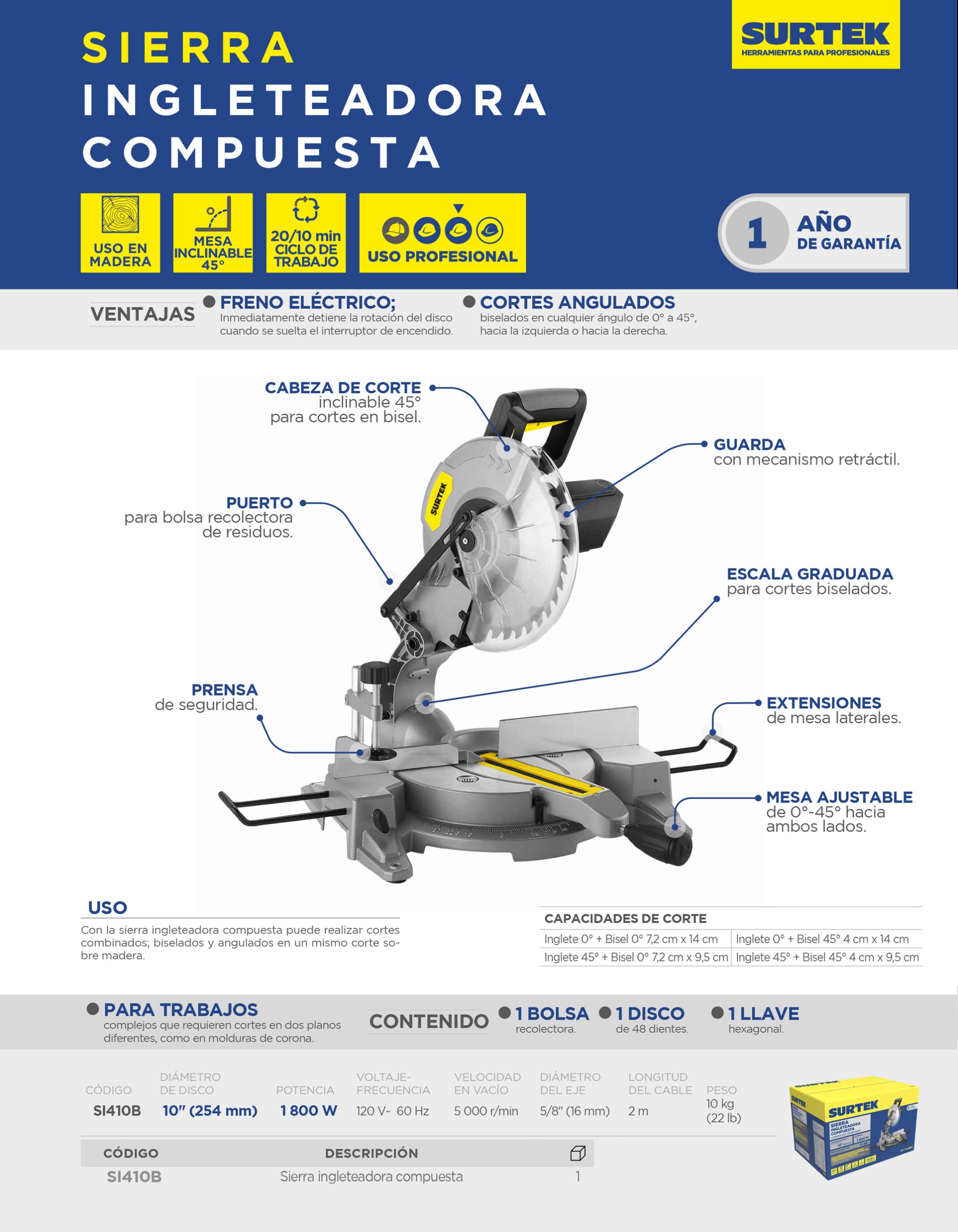 Sierra de inglete compuesta 10″ 1800 W Surtek