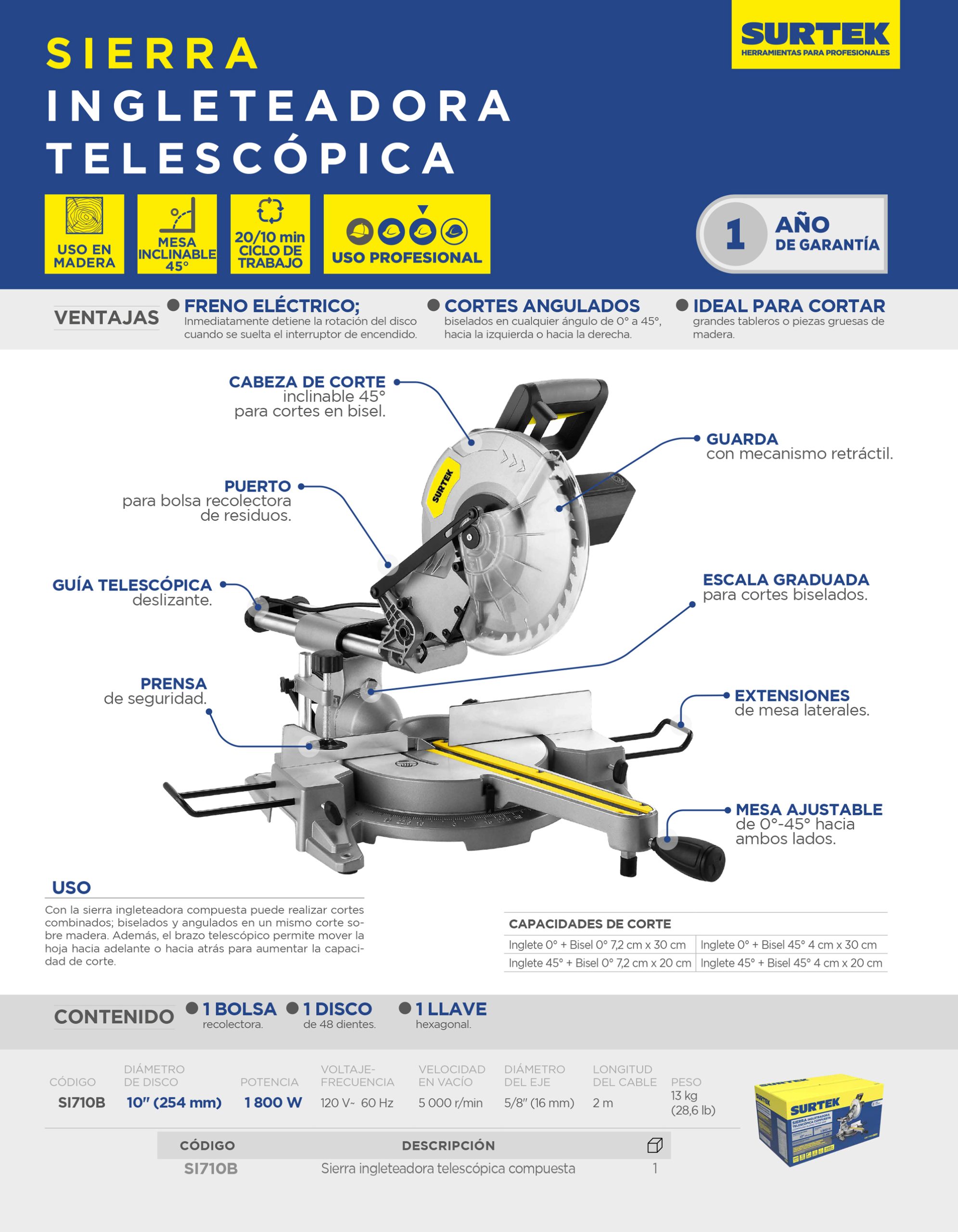 Sierra de inglete telescópica 10″ 1800 W Surtek